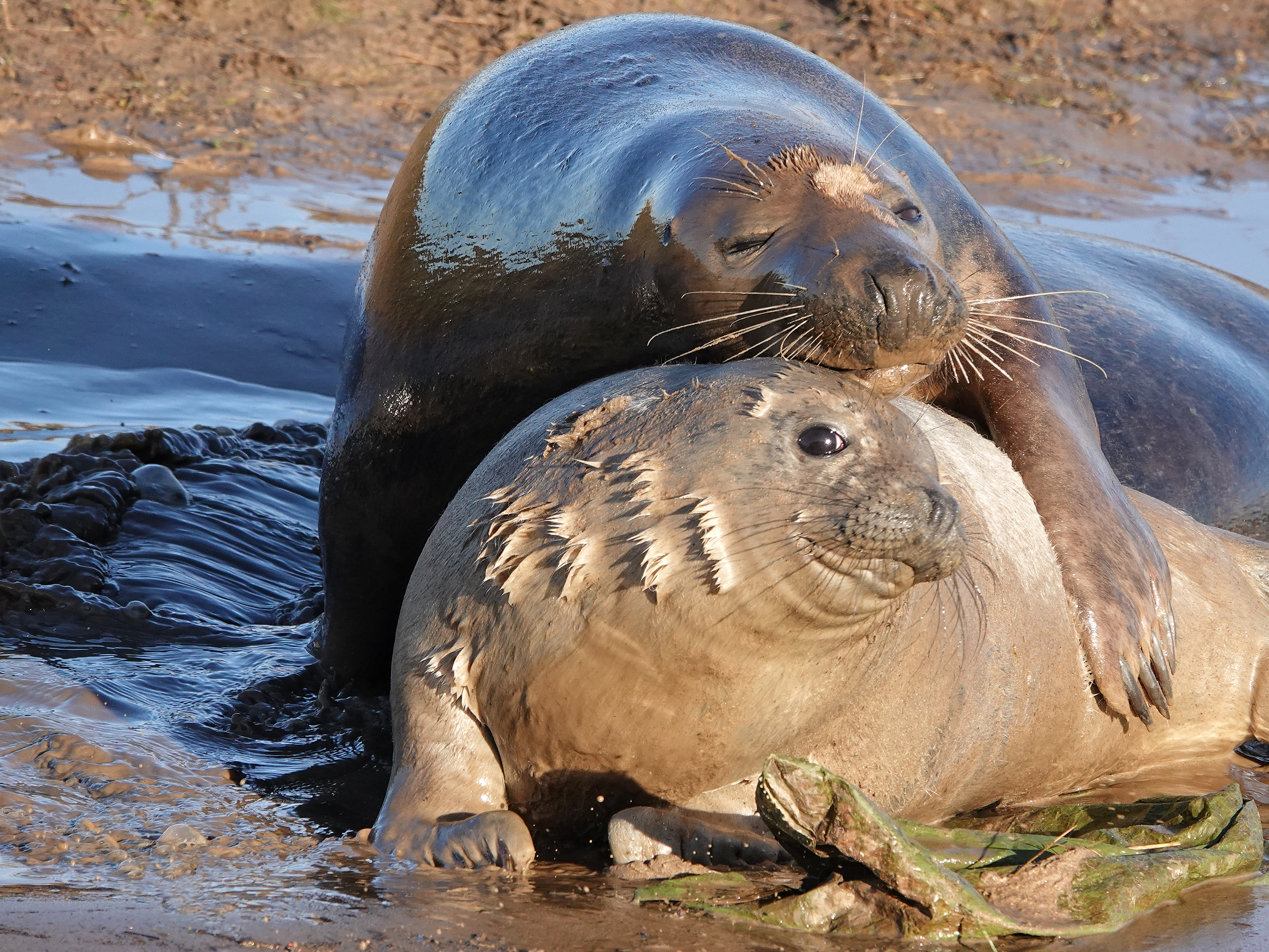 A mother seal gives her baby a hug before it goes out to sea on its own at Donna Nook, on the Lincolnshire coast, UK in the first decade of December 2024. (Photo by Paul Biggs/Animal News Agency)
