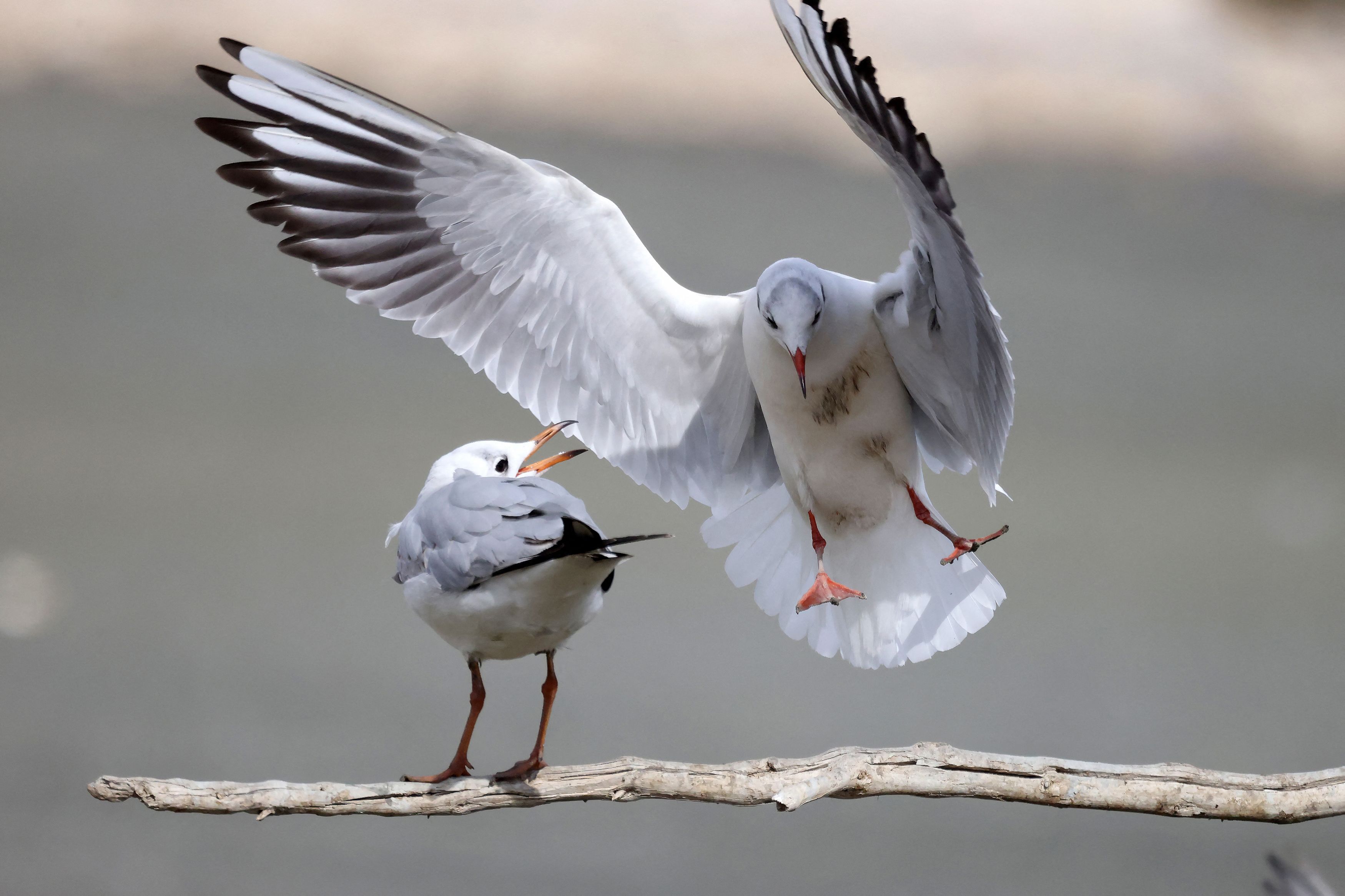 Seagulls interact on the branch of a tree on the beach in Kuwait City on December 12, 2024. (Photo by Yasser Al-Zayyat/AFP Photo)