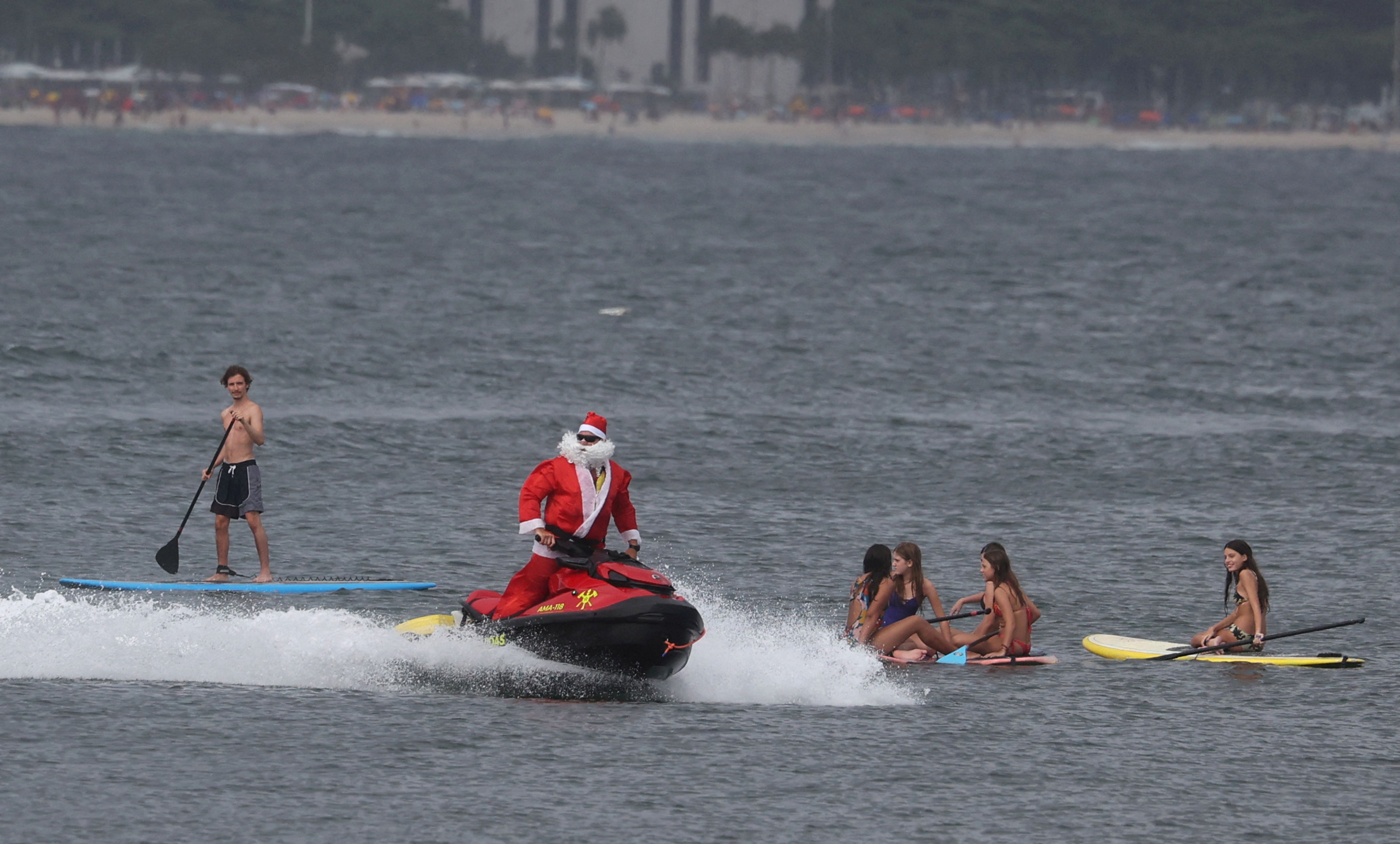 Firefighter Thiago Paiva, dressed as Santa Claus, rides on a jet ski during Christmas season celebrations in Copacabana beach in Rio de Janeiro, Brazil on December 17, 2024. (Photo by Pilar Olivares/Reuters)