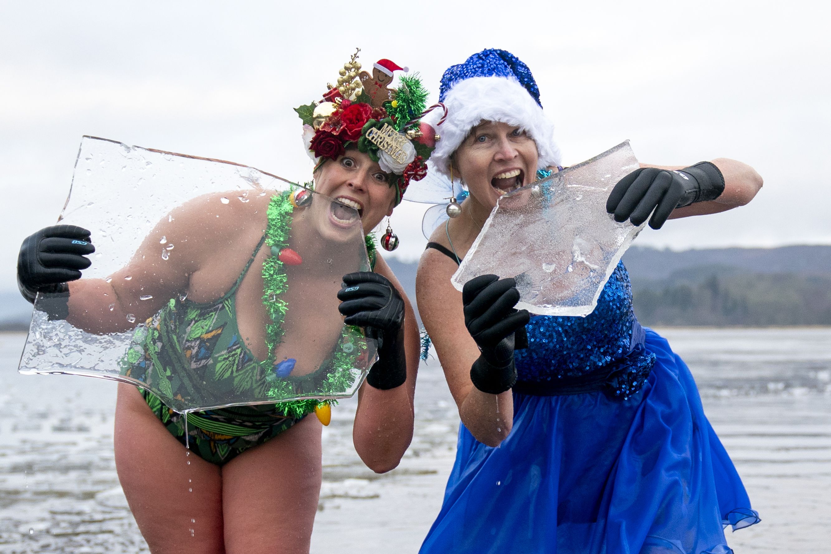 Alice Goodridge (left) and Tanya Mackenzie (right), members of the Loch Insh Dippers wild swim group, take part in a Christmas-themed swim in the frozen Loch Insh, Kingussie, in the Cairngorms National Park, Scotland on Friday, December 13, 2024. (Photo by Jane Barlow/PA Images via Getty Images)