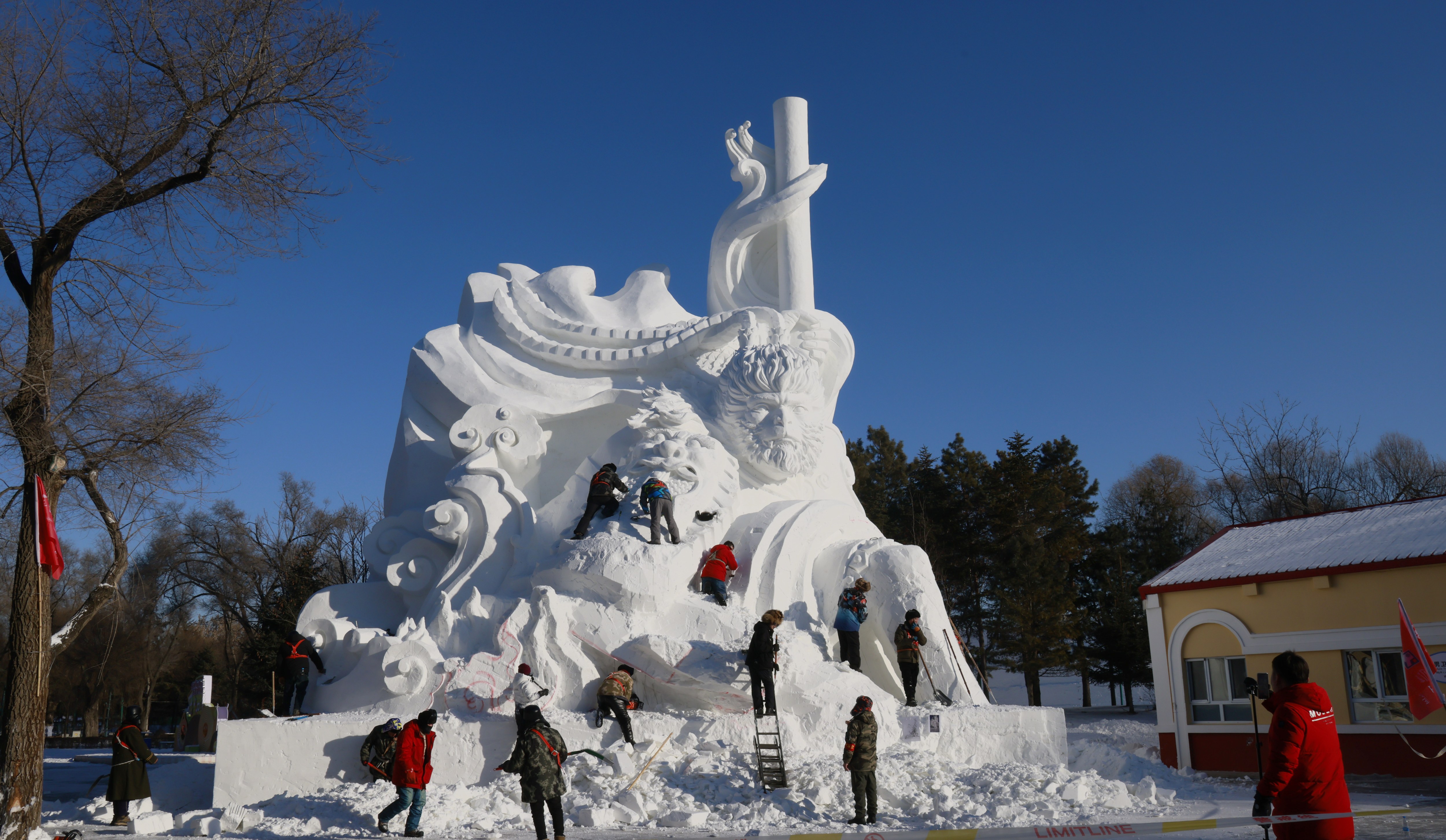Sculptors carve a snow sculpture with the character Monkey King from the Chinese game “Black Myth: Wukong” as the model sample at the 37th Harbin Sun Island International Snow Sculpture Art Expo on December 11, 2024 in Harbin, Heilongjiang Province of China. (Photo by VCG/VCG via Getty Images)