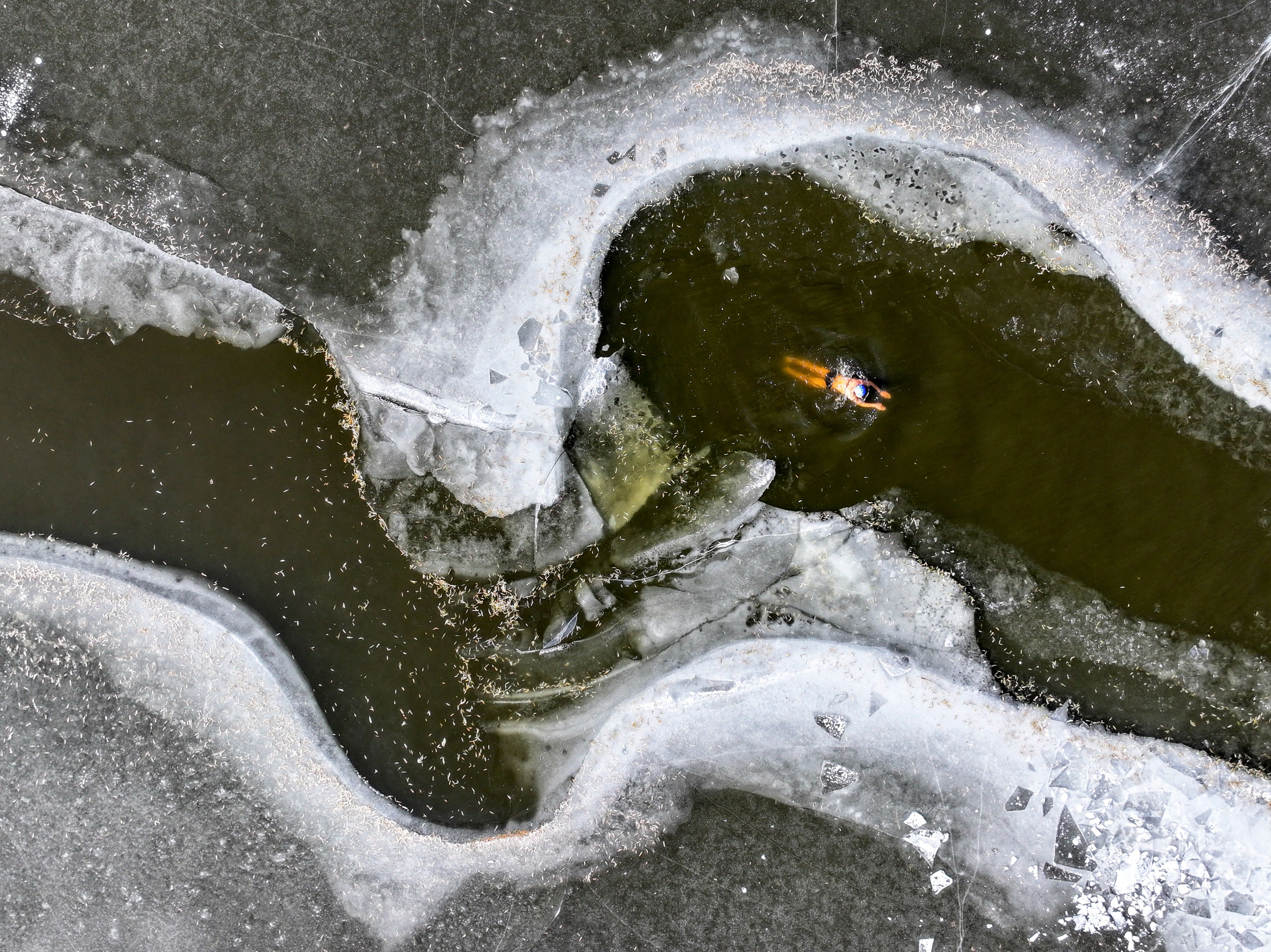 A winter swimming enthusiast braves cold to swim in partly frozen Hunhe River on December 18, 2024 in Shenyang, Liaoning Province of China. (Photo by Wang Ruizhong/VCG via Getty Images)