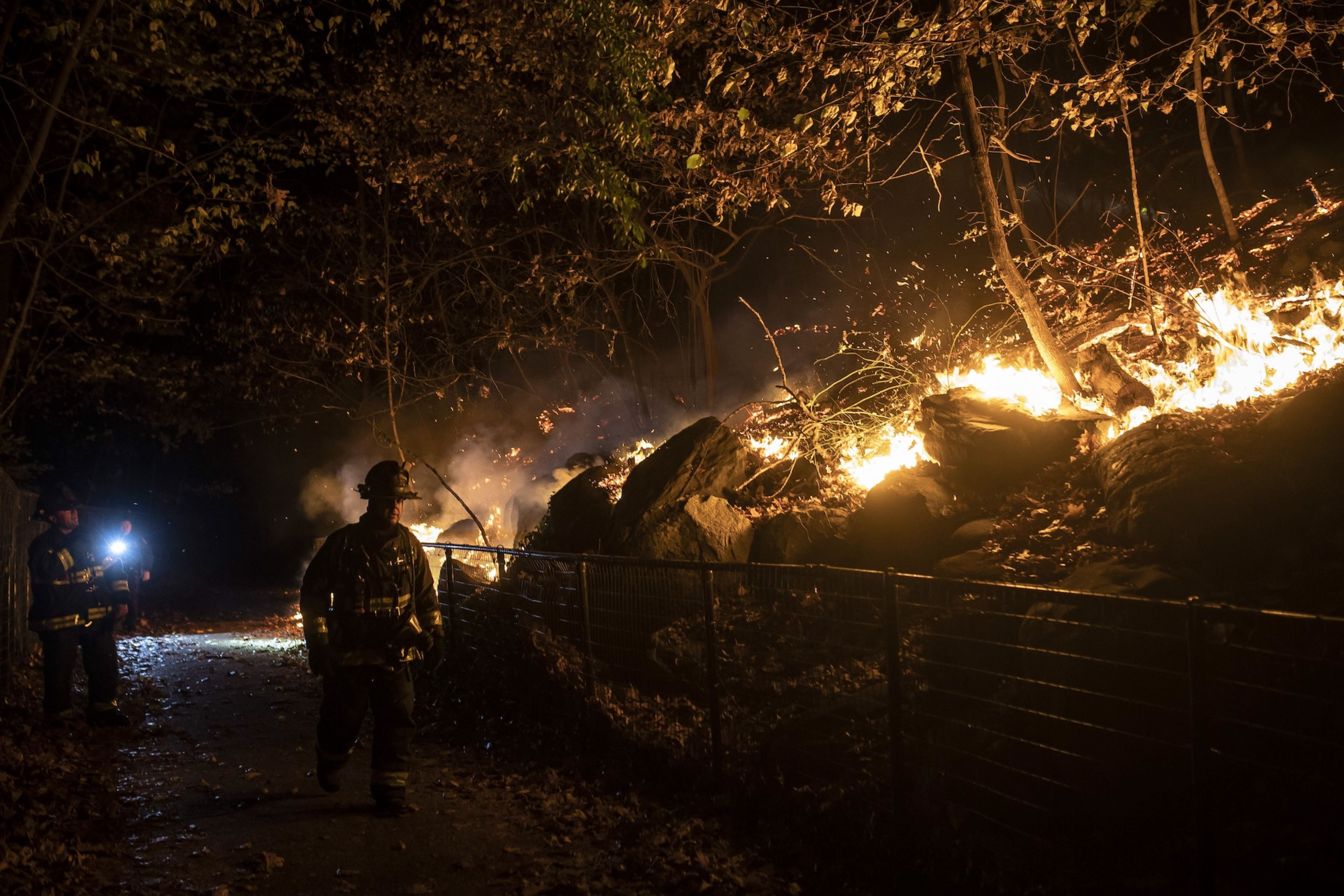 A brush fire burns at Prospect Park in Brooklyn, New York, on Friday, November 8, 2024. It took over three hours to extinguish. (Photo by Benjamin Norman/The New York Times/Redux)