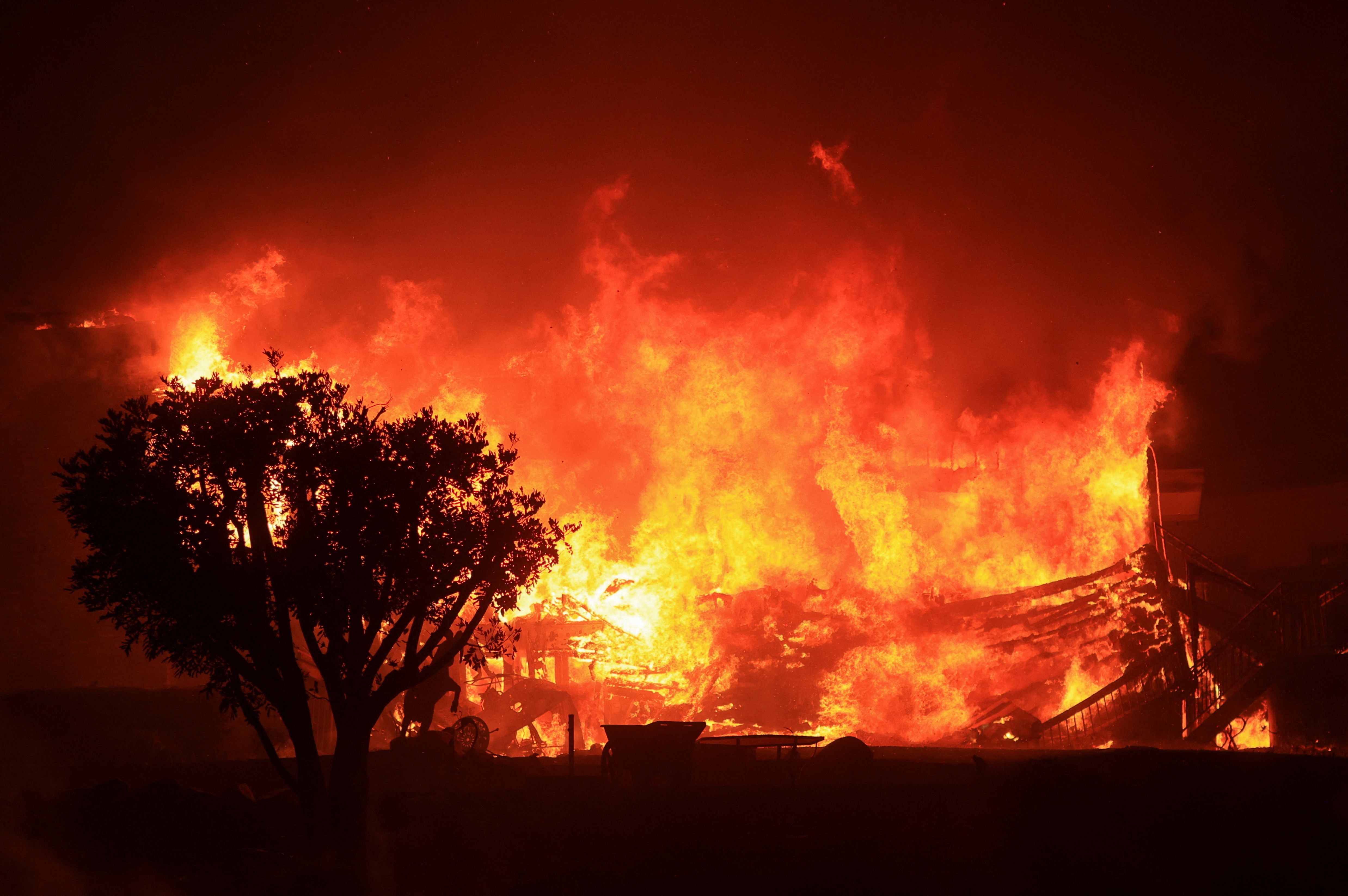 Flames and smoke rise from a building following the Mountain Fire in Camarillo, California on November 6, 2024. (Photo by David Swanson/Reuters)