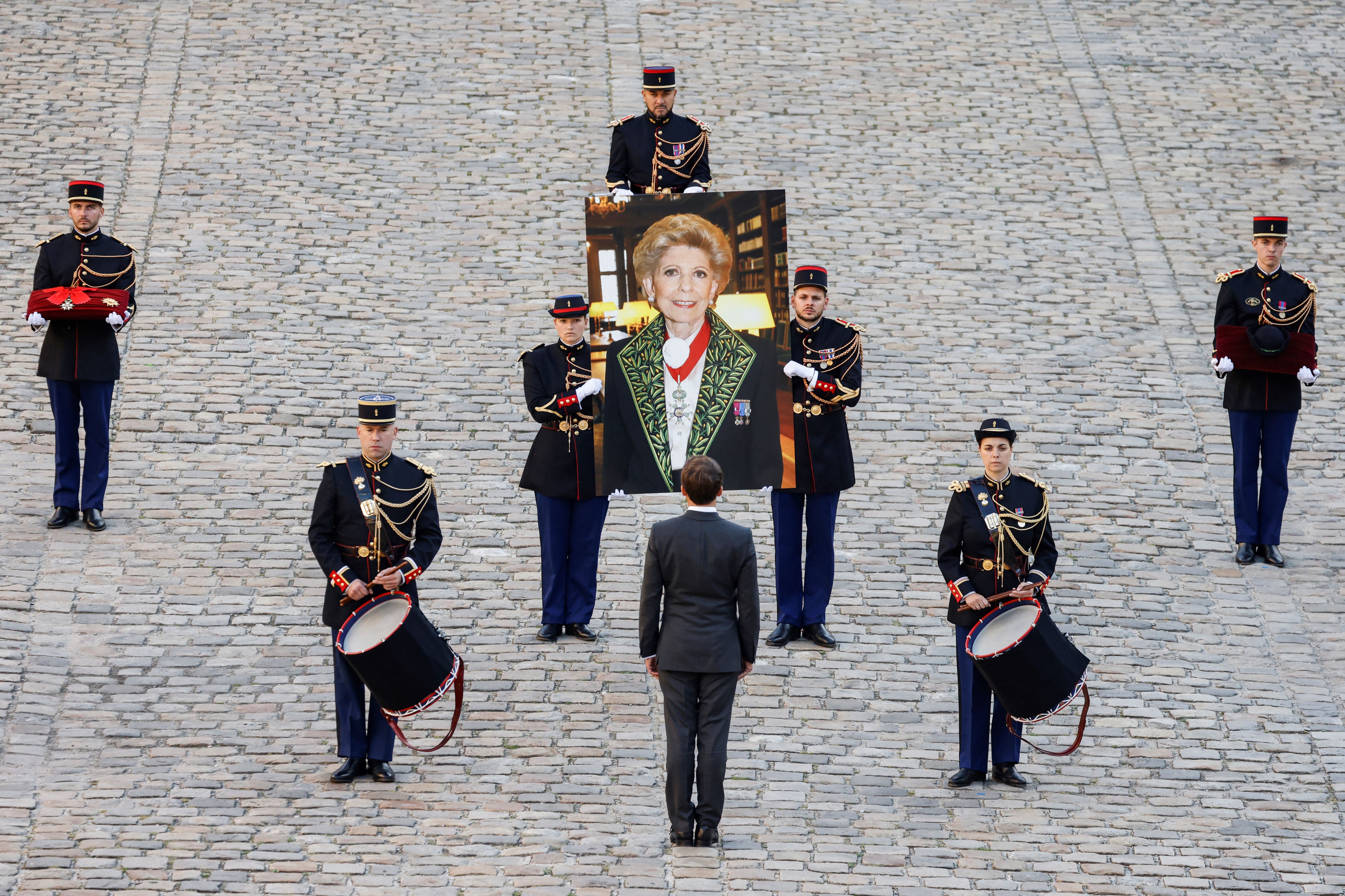 French President Emmanuel Macron (C) stands as Republican Guards carry a portrait of late French historian and perpetual secretary of the Academie Francaise (French Academy) Helene Carrere d'Encausse during a national homage in her tribute at the Hotel des Invalides in Paris, on October 3, 2023. (Photo by Ludovic Marin/AFP Photo)