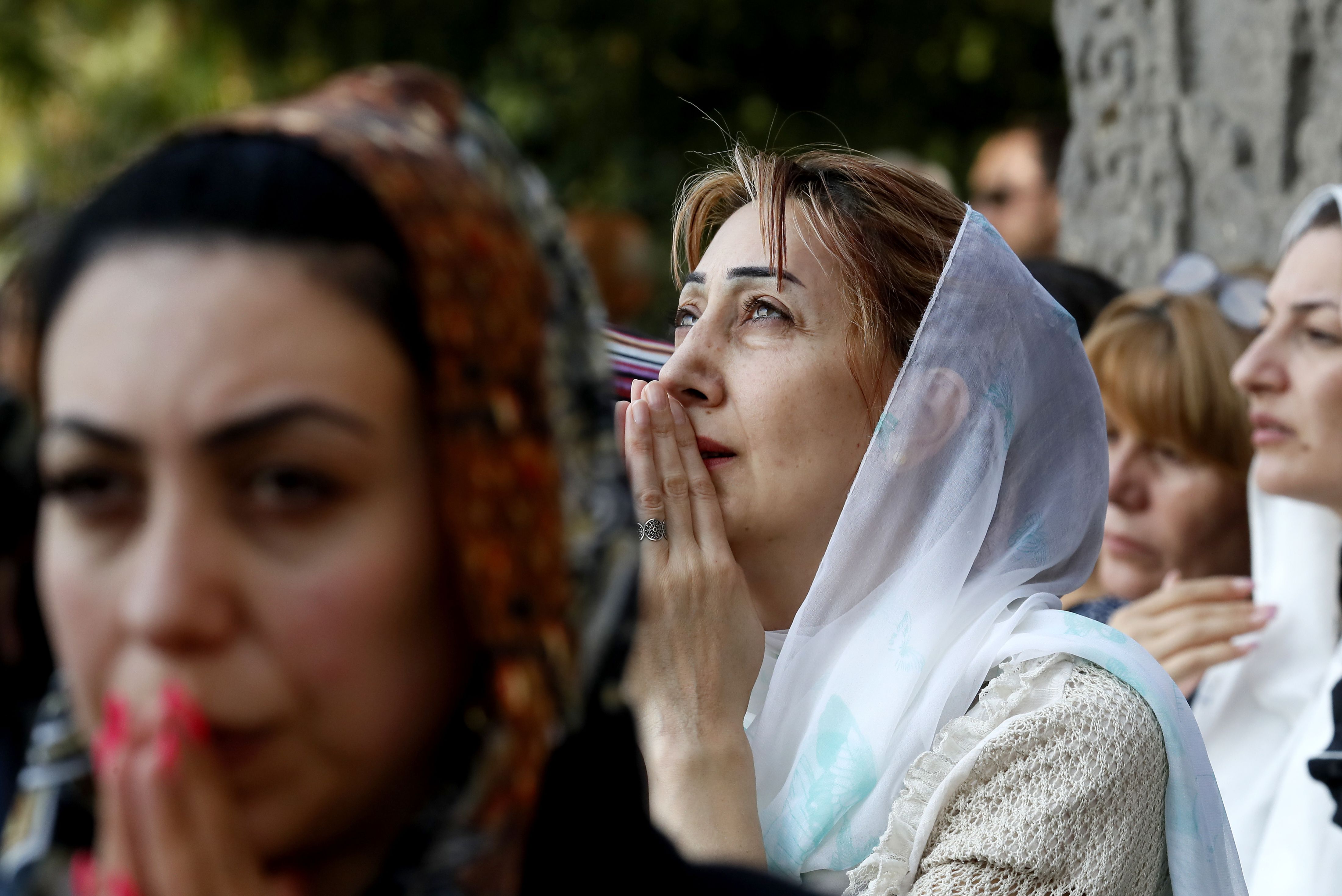 Armenians pray during the Divine Liturgy at the Open Altar of St. Trdat in the Mother See of Holy Etchmiadzin, Armenia, 01 October 2023. Under the chairmanship of His Holiness Garegin II, Supreme Patriarch and Catholicos of All Armenians, the day of 01 October was declared the National Day of Prayer for Artsakh, on the occasion of which a special prayer service was held in the Mother See of Holy Etchmiadzin and in all churches of Armenia and the Diaspora. Azerbaijan on 19 September 2023 launched a brief military offensive on the contested region of Nagorno-Karabakh, a breakaway enclave that is home to some 120,000 ethnic Armenians. Following a ceasefire agreed on 20 September 2023, Azerbaijan opened all checkpoints with Armenia for the unimpeded exit of civilians from the disputed territory. The Armenian government announced the evacuation of more than 100,000 local residents from Nagorno-Karabakh, and a humanitarian center has been set up in the village of Kornidzor near the so-called Lachin corridor, the main route between Armenia and the breakaway region. (Photo by Anatoly Maltsev/EPA/EFE)