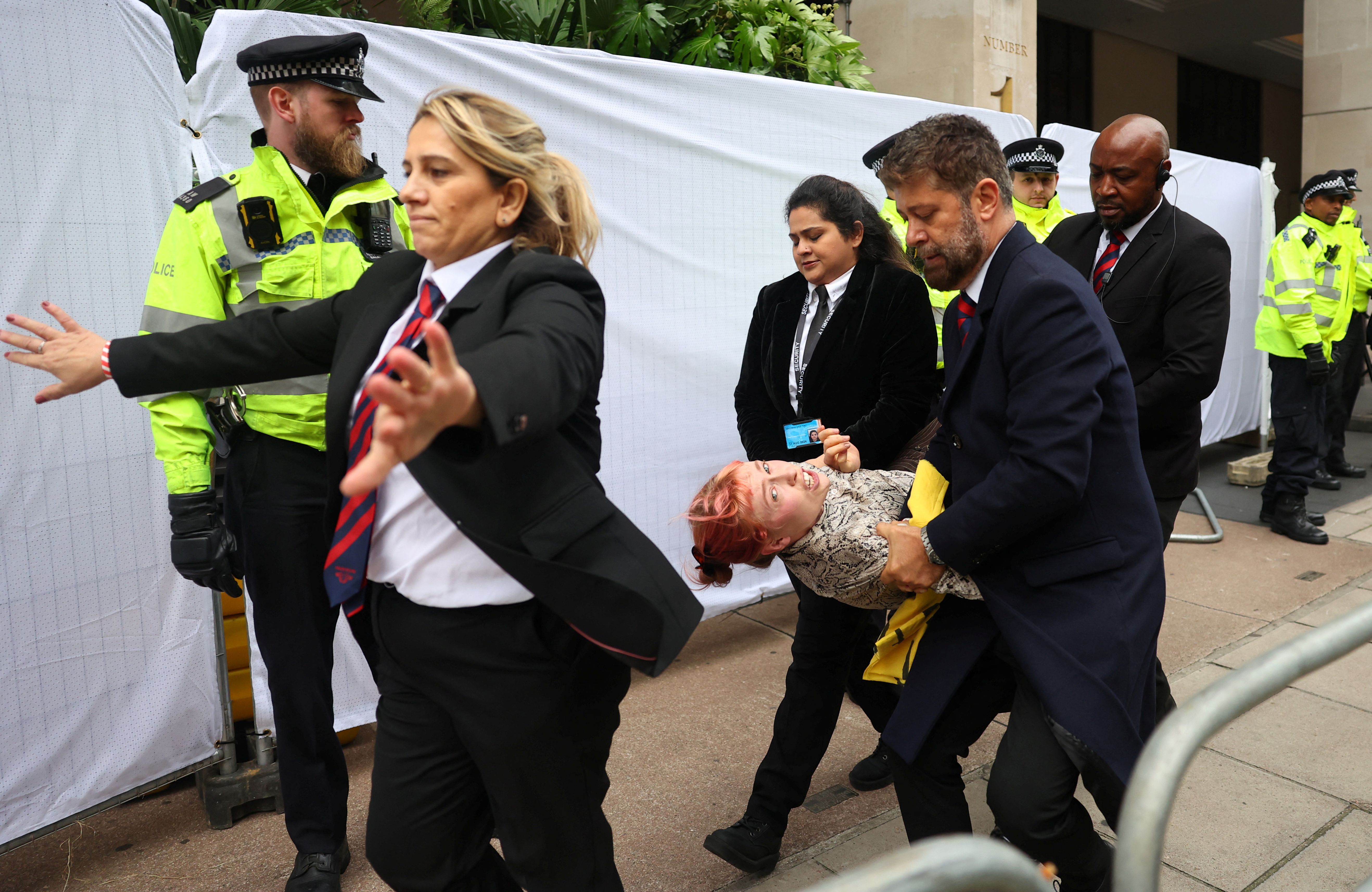 Police officers and security staff remove a demonstrator from the venue of the Energy Intelligence Forum, as Oily Money Out protests take place outside, in London, Britain on October 18, 2023. (Photo by Toby Melville/Reuters)