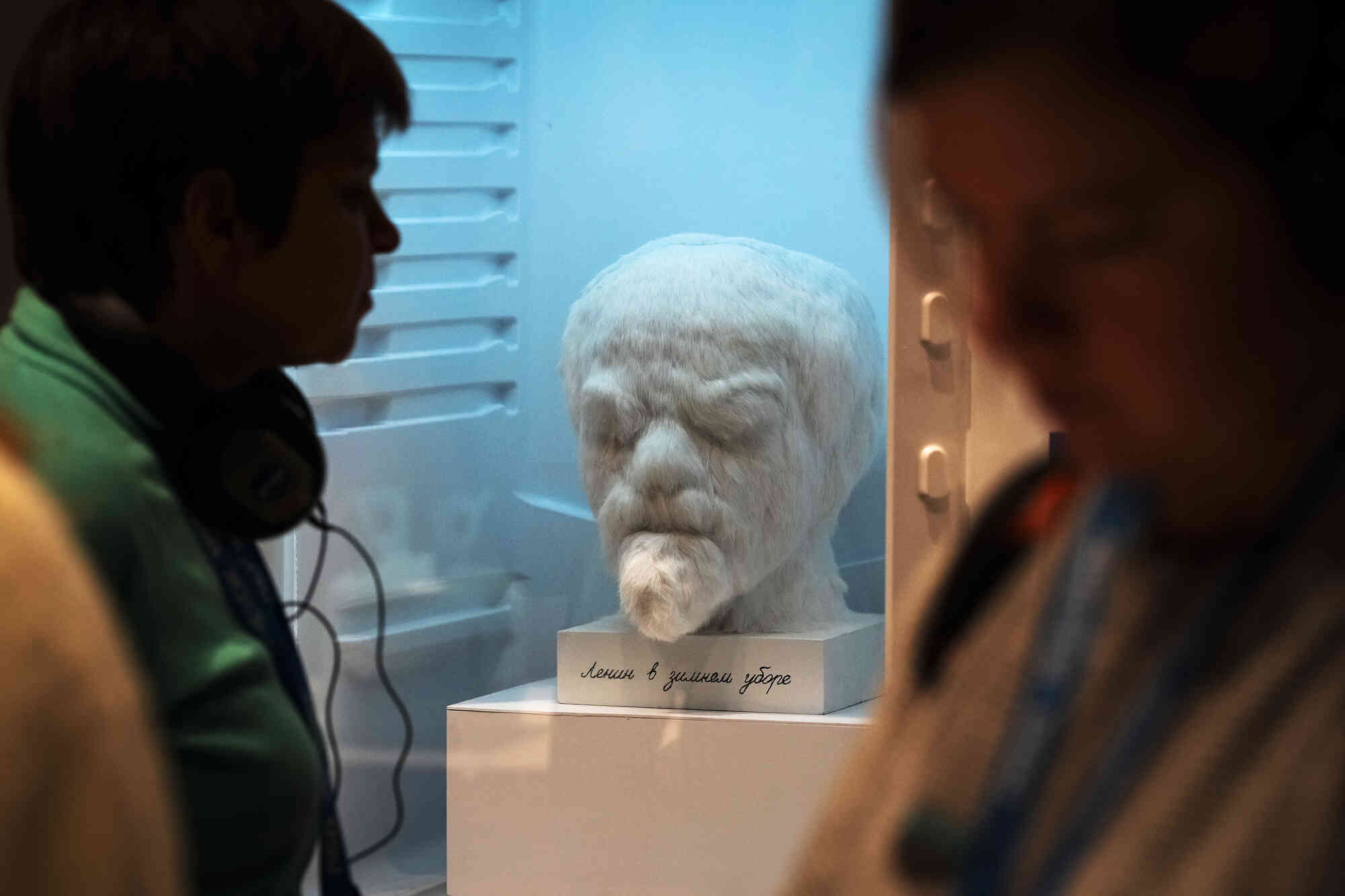 Visitors walk past a sculpture of Soviet Union founder Vladimir Lenin covered in fur and placed in a refrigerator with an inscription reading 'Lenin in winter attire' at the exhibition “Ice. Life”, in St. Petersburg, Russia, Saturday, November 23, 2024. (Photo by Dmitri Lovetsky/AP Photo)