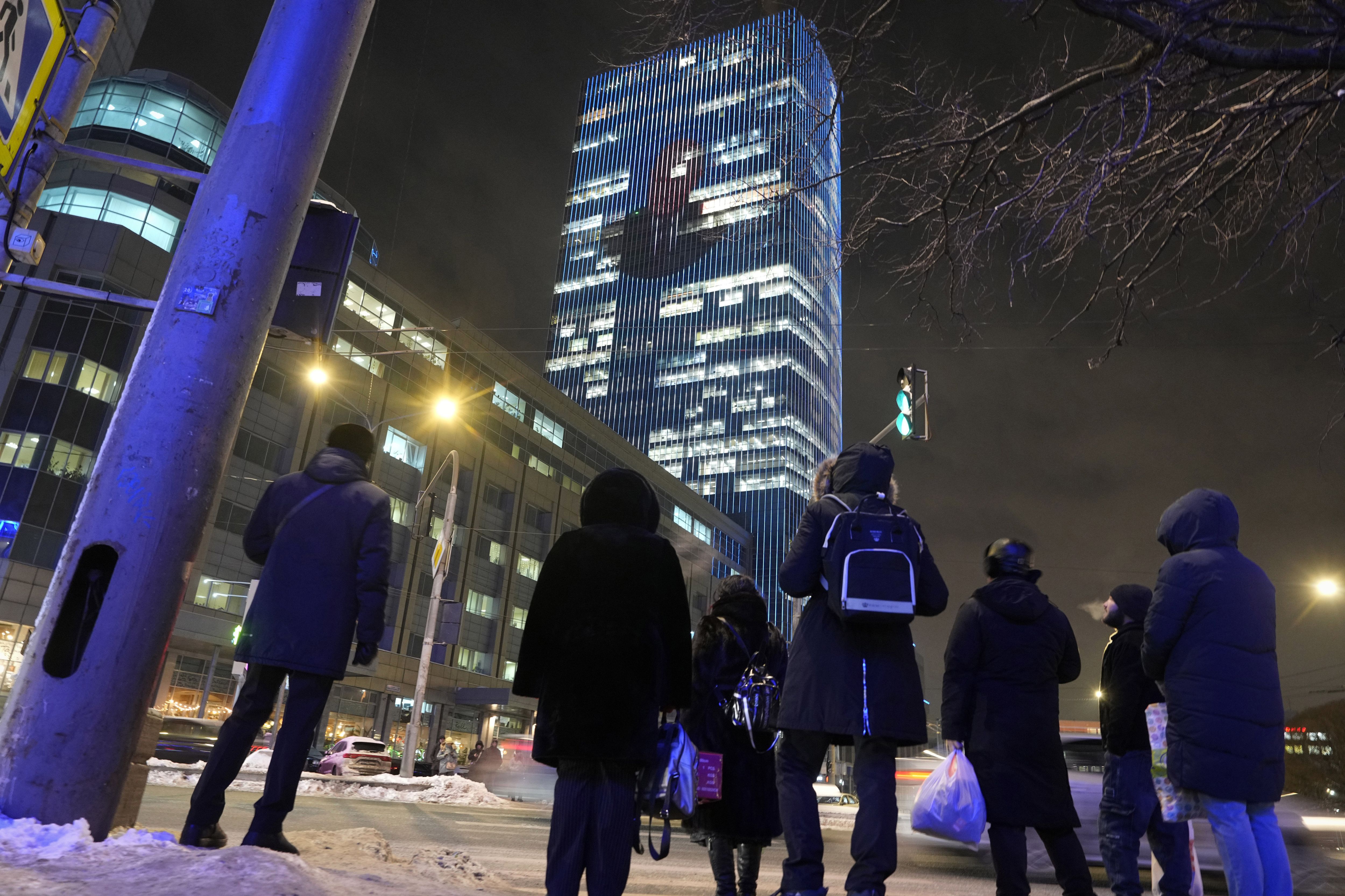 People look up at an image of Russian President Vladimir Putin, projected on the facade of a business building, in St. Petersburg, Russia, December 18, 2024, announcing Putin's annual news conference and call-in show. (Photo by Dmitri Lovetsky/AP Photo)