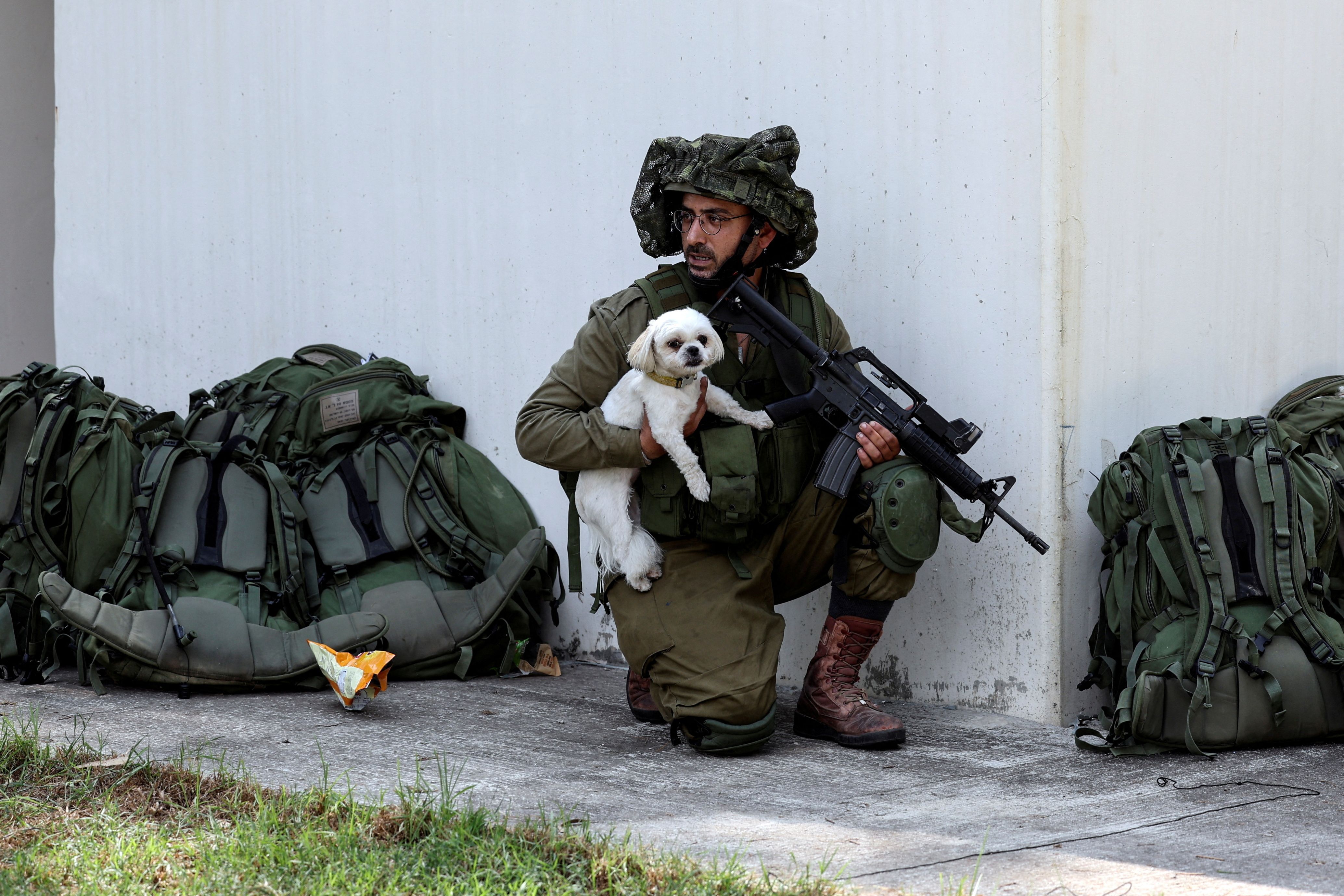 An Israeli soldier holds a rescued dog as he takes position near a bomb shelter in Kibbutz Kfar Aza, in southern Israel on October 10, 2023. (Photo by Ronen Zvulun/Reuters)