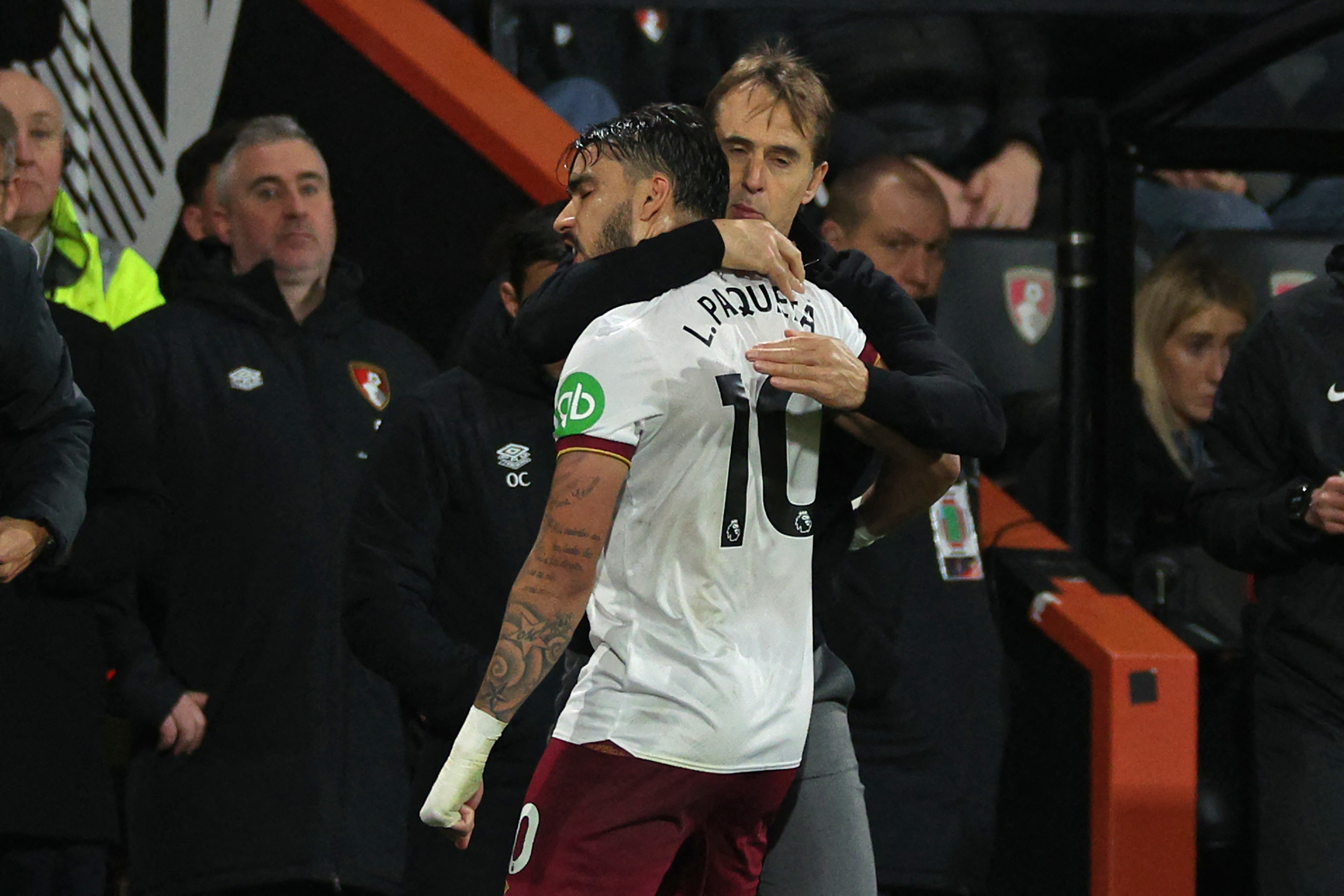West Ham United's Spanish manager Julen Lopetegui congratulates West Ham United's Brazilian midfielder #10 Lucas Paqueta on scoring the opening goal from the penalty spot during the English Premier League football match between Bournemouth and West Ham United at the Vitality Stadium in Bournemouth, southern England on December 16, 2024. (Photo by Adrian Dennis/AFP Photo)