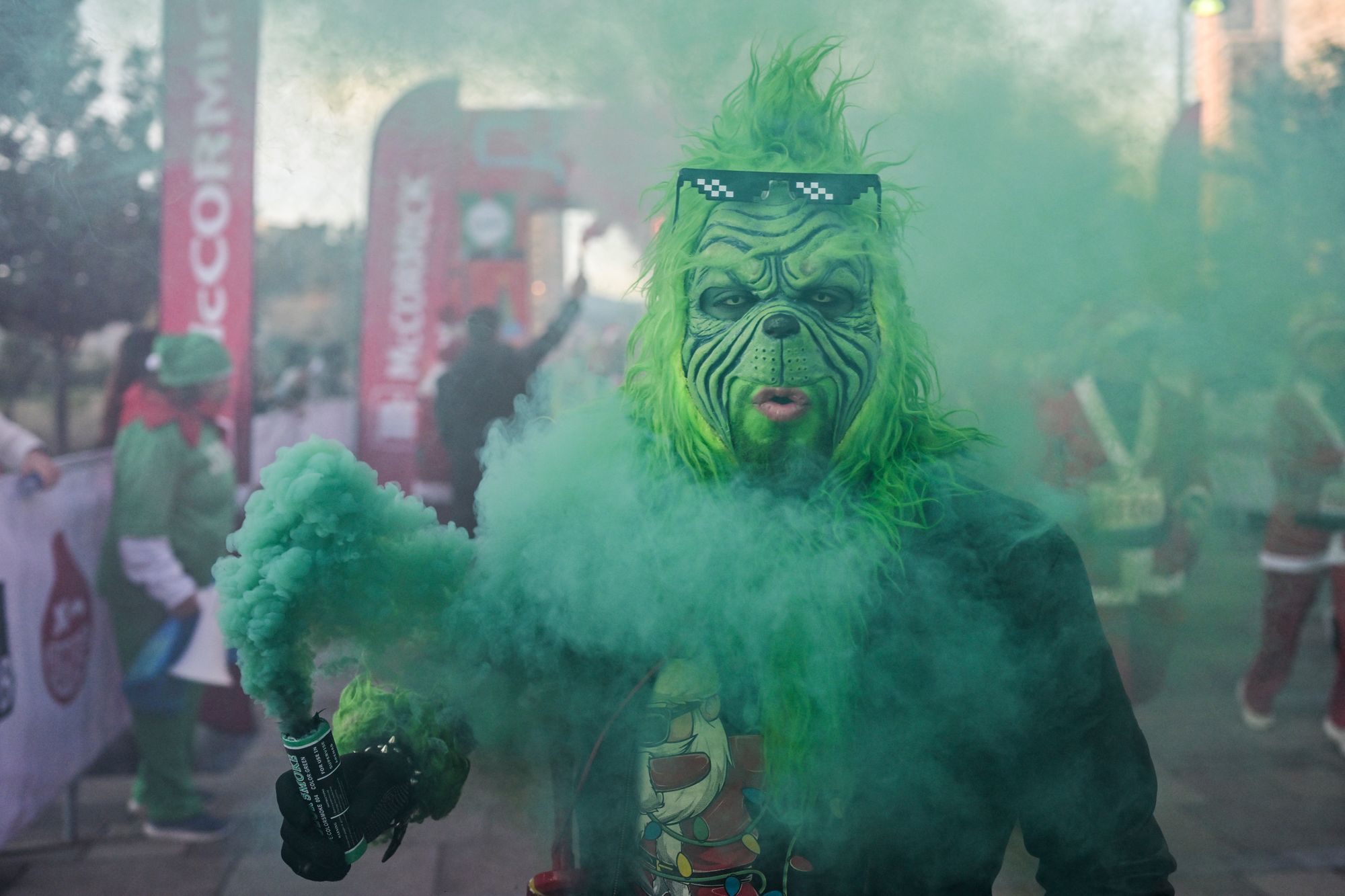 A man dressed as the Grinch holds a green flare during the “Santa Run” Christmas race in Mexico City on December 15, 2024. (Photo by Yuri Cortez/AFP Photo)