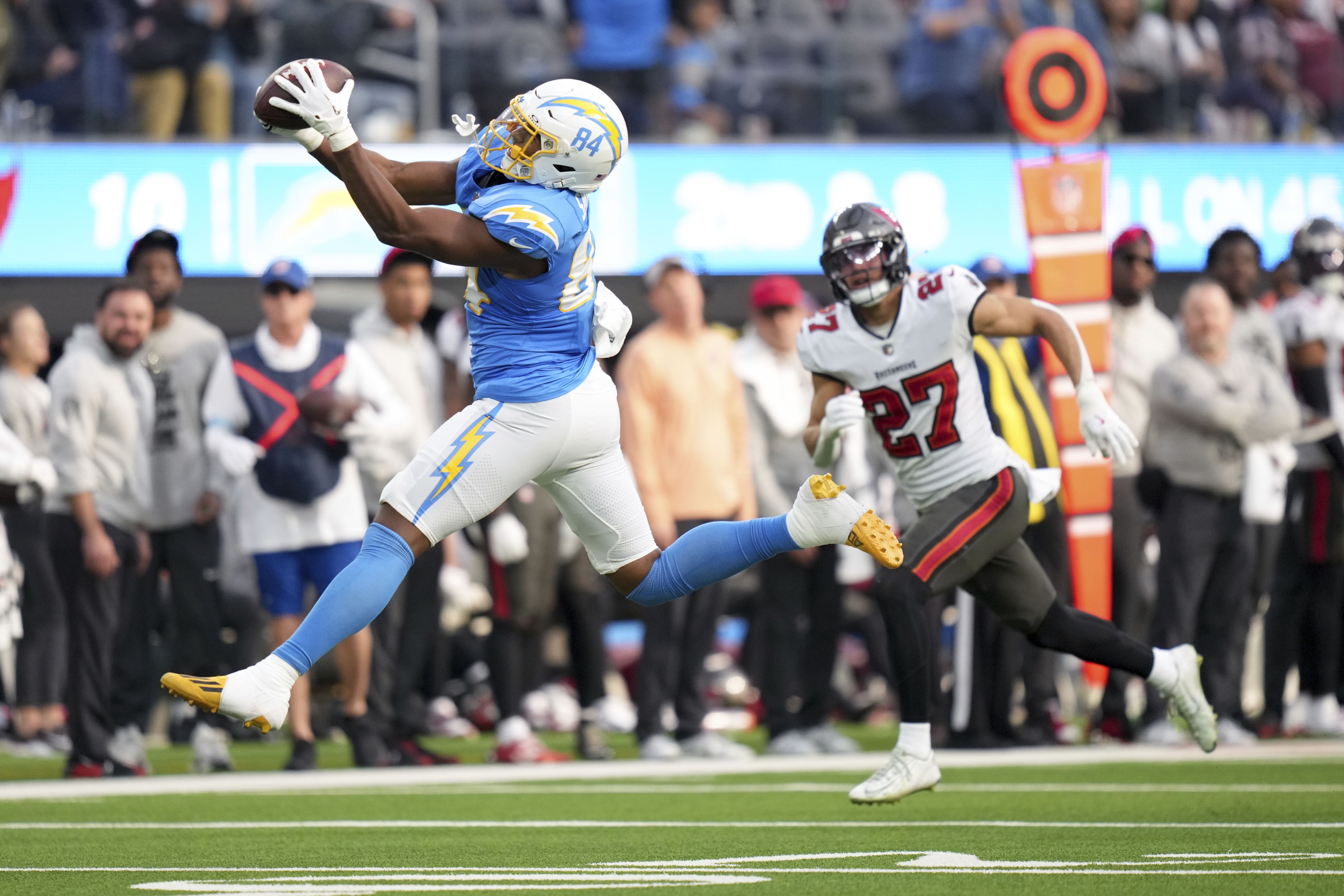 Los Angeles Chargers tight end Stone Smartt (84) makes a catch during the first half of an NFL football game against the Tampa Bay Buccaneers, Sunday, December 15, 2024, in Inglewood, Calif. (Photo by Eric Thayer/AP Photo)