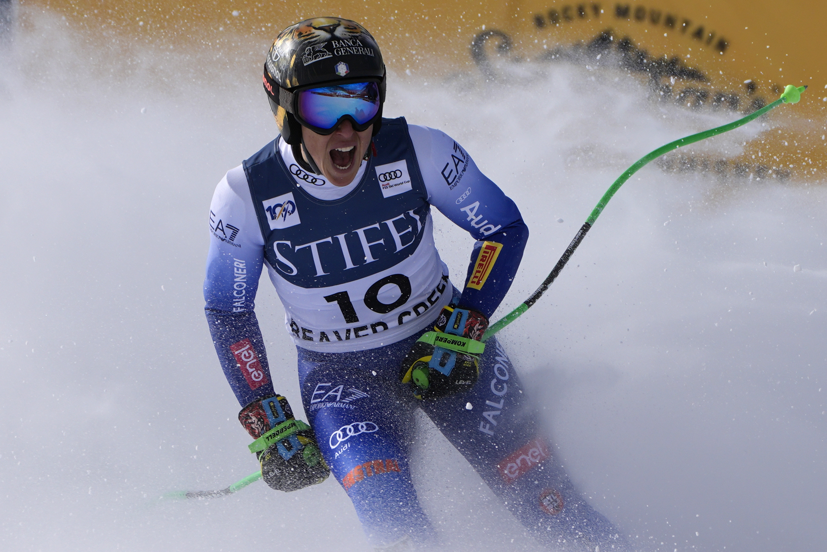 Italy's Federica Brignone reacts after finishing a women's World Cup super-G ski race, Sunday, December 15, 2024, in Beaver Creek, Colo. (Photo by John Locher/AP Photo)