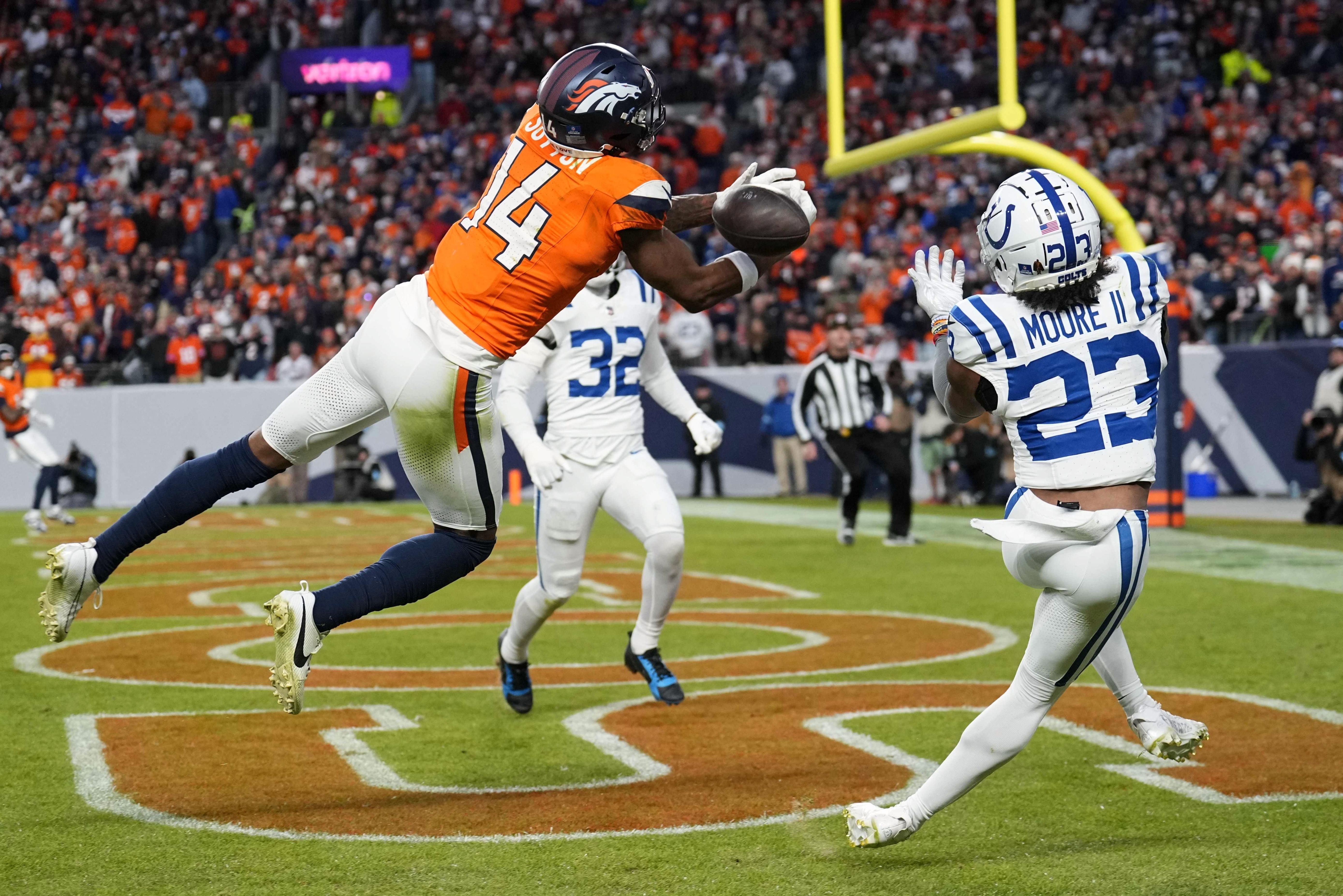 Denver Broncos' Courtland Sutton drops a pass in front of Indianapolis Colts' Kenny Moore II during the second half of an NFL football game Sunday, December 15, 2024, in Denver. (Photo by Jack Dempsey/AP Photo)