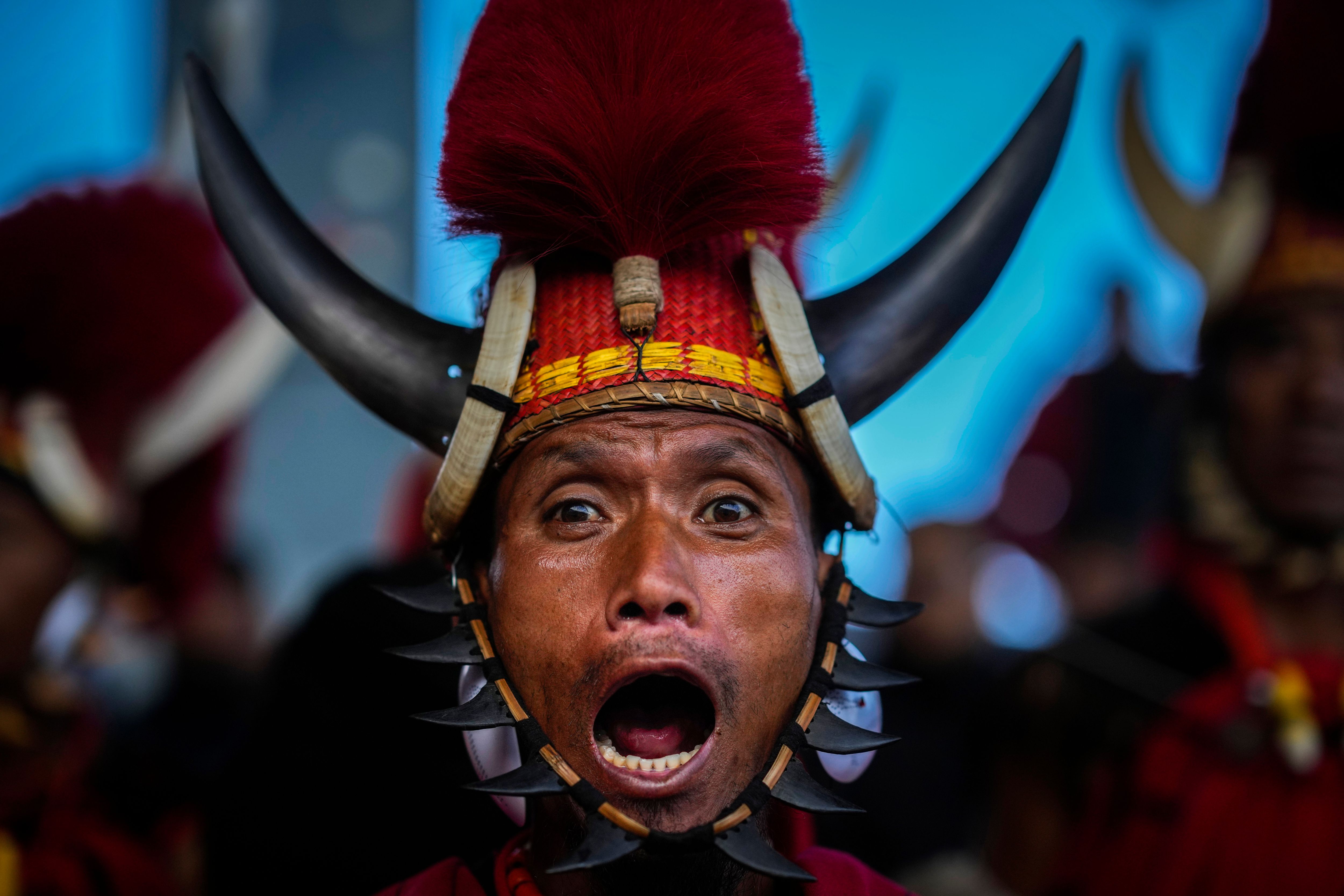 An Indigenous Naga tribal sings during the Hornbill Festival in Kisama, on the outskirts of Kohima, capital of the northeastern Indian state of Nagaland, Tuesday, December 10, 2024. (Photo by Anupam Nath/AP Photo)