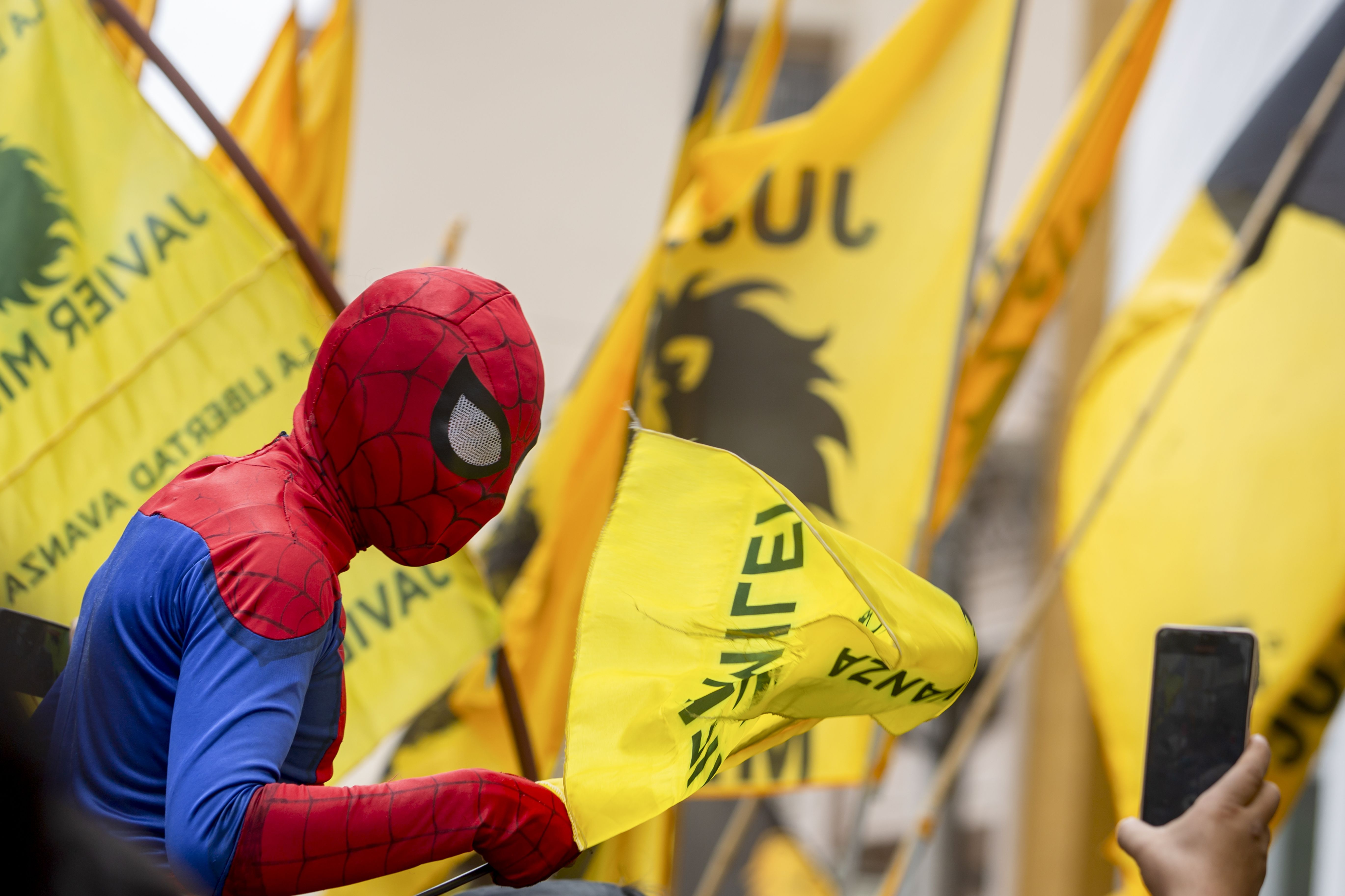 A Spiderman costume wearing supporter of presidential hopeful of the Liberty Advances coalition, Javier Milei, gathers with other supporters outside the hotel where he arrived in Salta, Argentina, Thursday, October 12, 2023. Elections are set for Oct. 22. (Photo by Javier Corbalan/AP Photo)