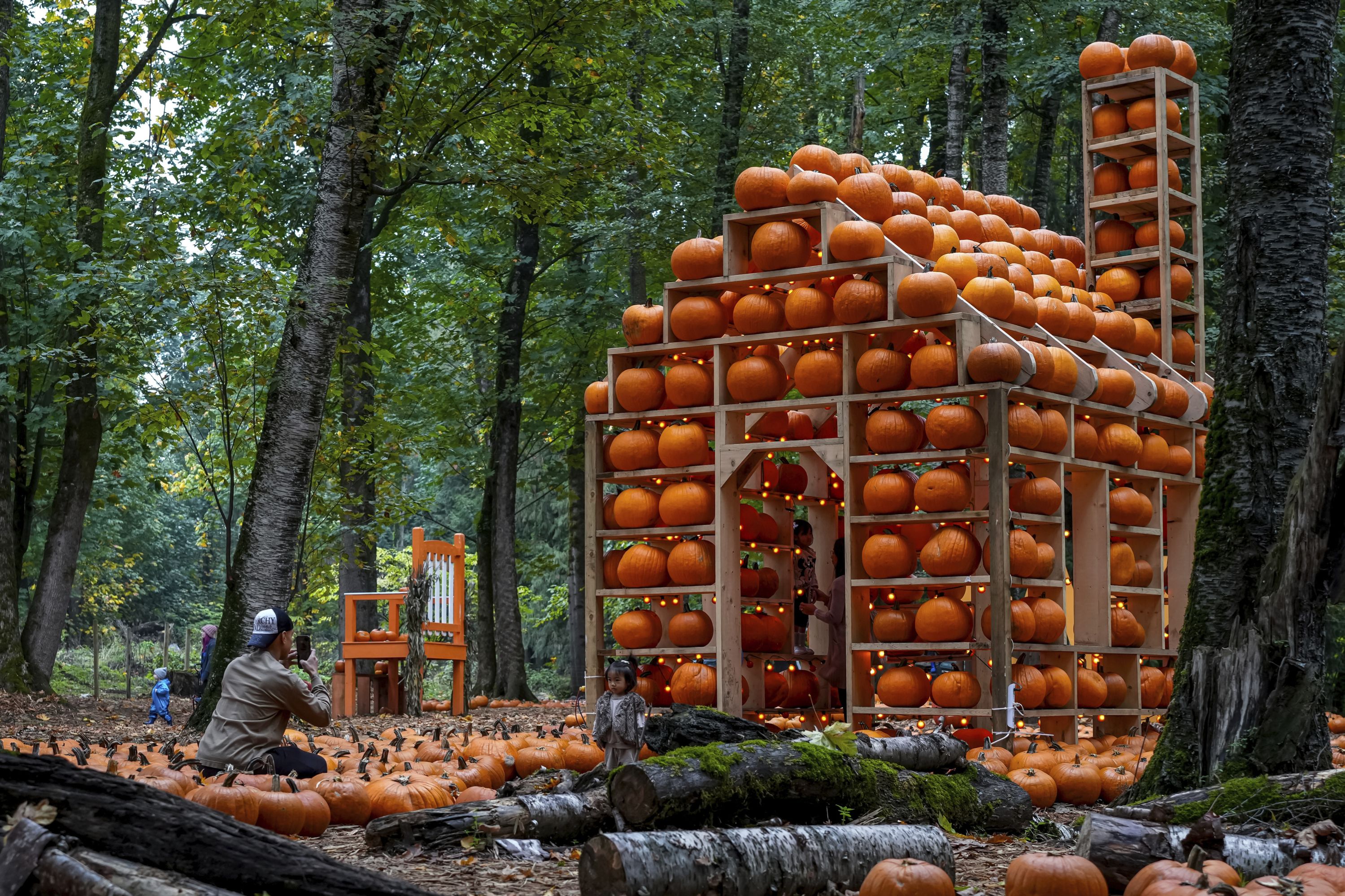 A man takes a photo of his daughter at a pumpkin patch in Abbotsford, British Columbia, on Sunday, October 22, 2023. (Photo by Ethan Cairns/The Canadian Press via AP Photo)