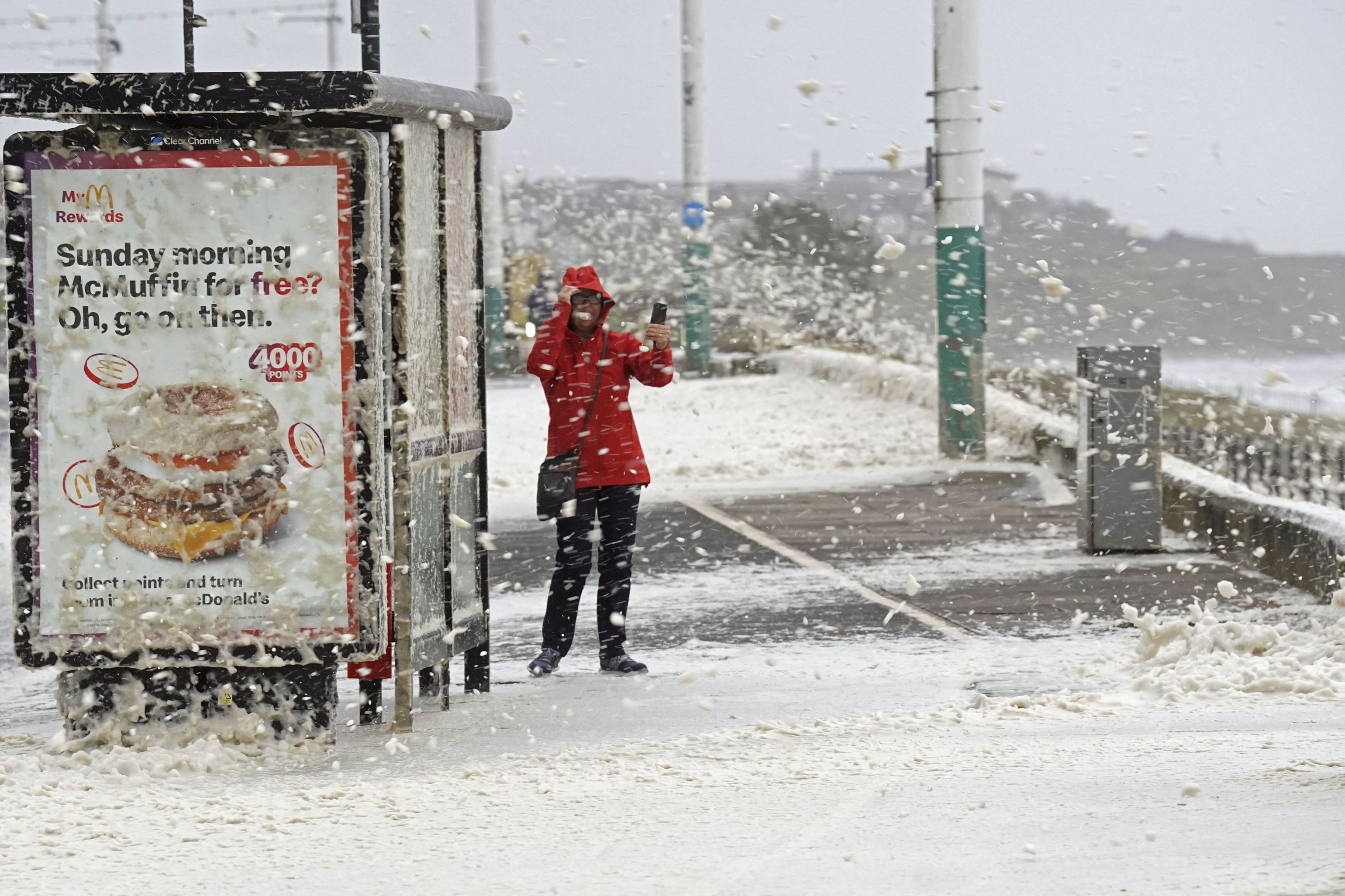 A woman stands as sea foam is brought in by the strong wind in Seaburn, northeastern England, Friday, October 20, 2023. The gale-force winds are expected to hit hardest the eastern part of Denmark's Jutland peninsula and the Danish islands in the Baltic Sea. But the British Isles, southern Sweden, northern Germany and parts of Norway also on the path of the storm, named Babet by U.K.’s weather forecaster, the Met Office. (Photo by Owen Humphreys/PA Wire via AP Photo)
