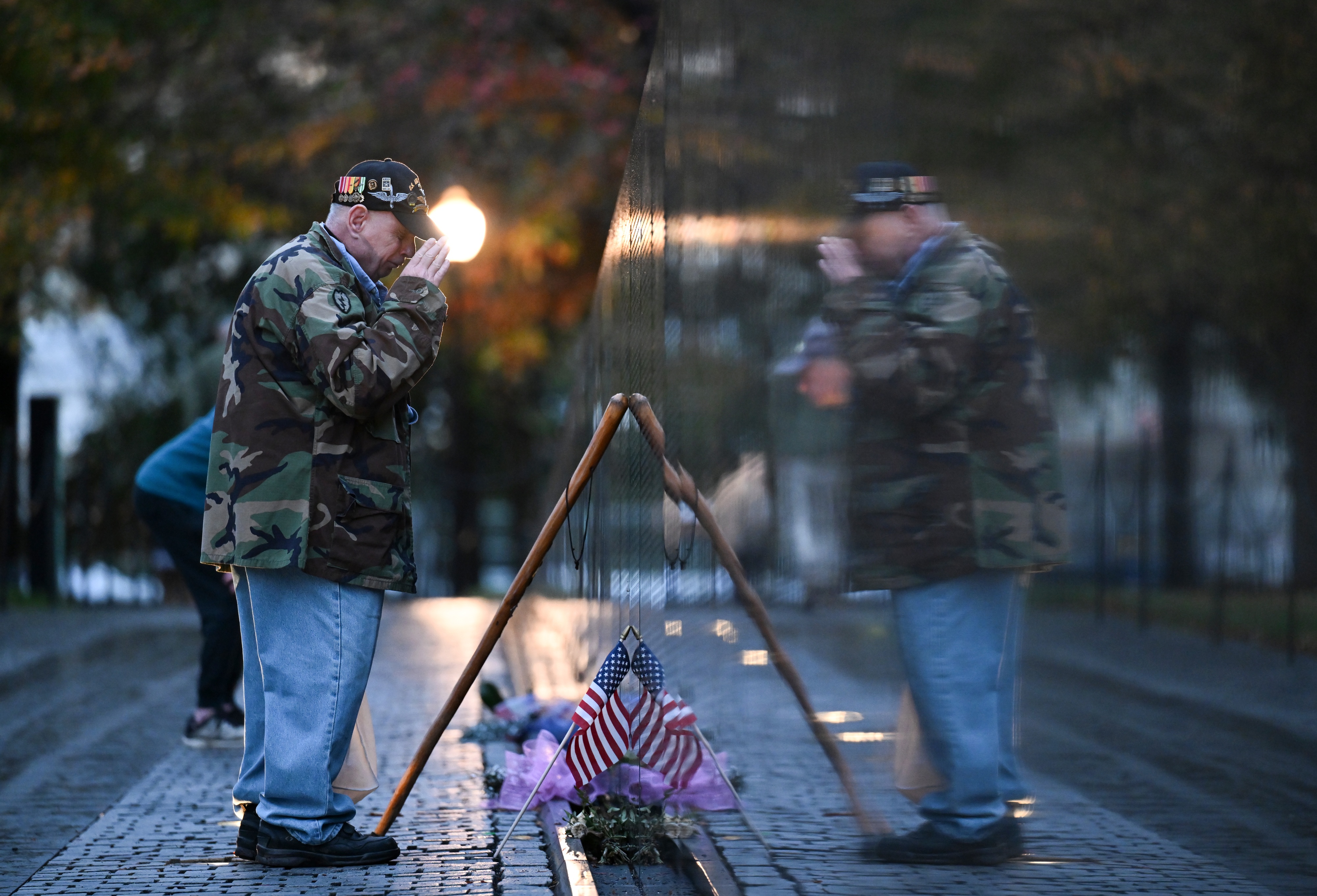 Bernie Klemanek, of Mineral, Va., salutes after placing a flag at the Vietnam Veterans Memorial on Veterans Day in Washington on November 11, 2024. (Photo by Matt McClain/The Washington Post)