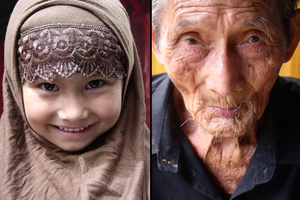 Left: Young Uyghur girl wearing a traditional hijab headdress, Xinjiang. Right: 109-year-old man from a “Longevity Village” in western Guangxi, where all residents have lived till at least a hundred years of age. (Photo by Tom Carter)