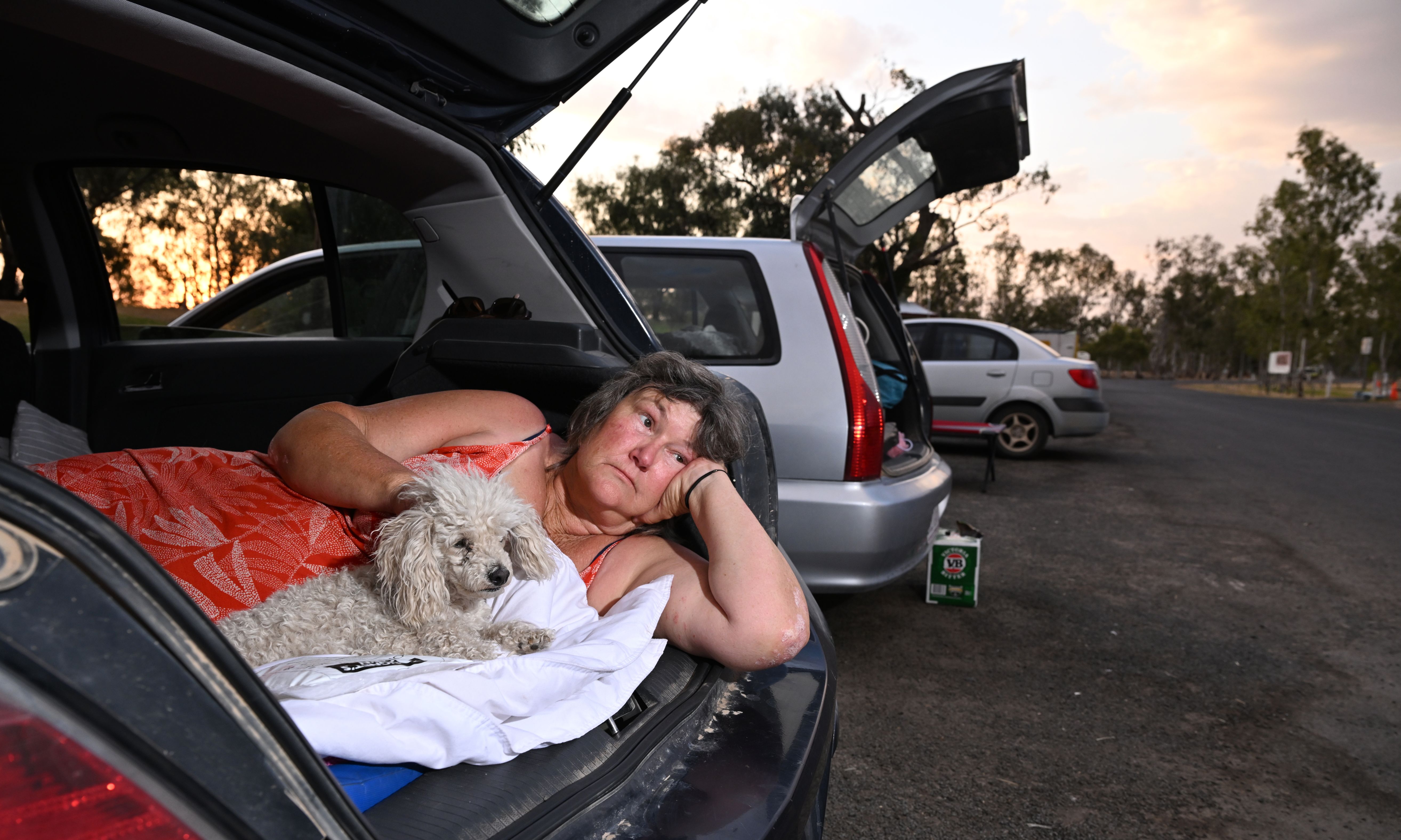 Tara bushfire evacuee Joanne Hill has been sleeping in her car with her three dogs at the Tara Lagoon after being forced to leave her home due to the encroaching bushfires in Tara, Queensland, Australia on Tuesday, October 31, 2023. Extreme conditions are forecast as fires rage across Queensland for a second week, with more houses under threat as relief crews arrive to help. (Photo by Darren England/AAP Image)