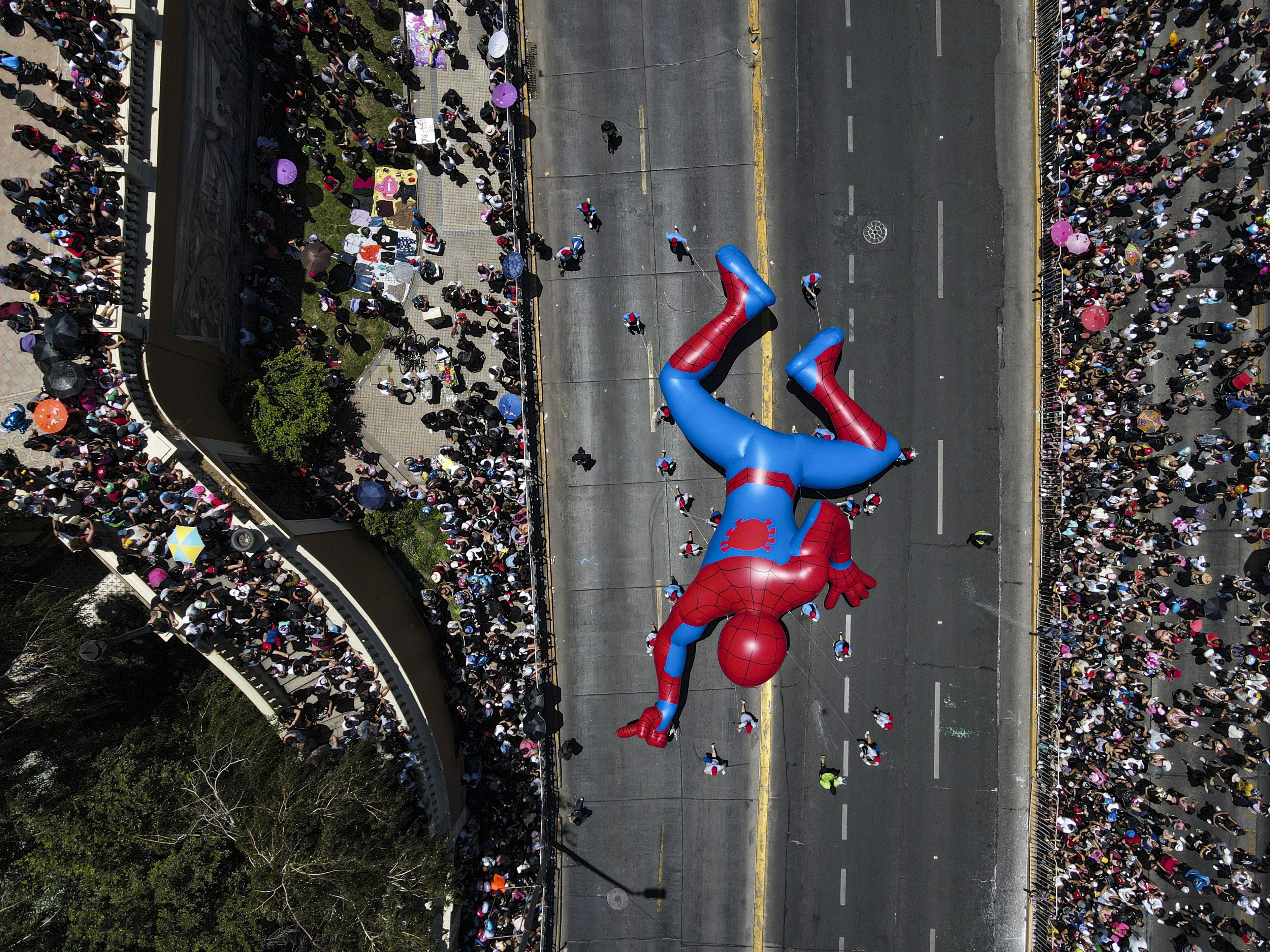 A Spiderman balloon passes through a street during a Christmas festival in Santiago, Chile, Sunday, December 1, 2024. (Photo by Esteban Felix/AP Photo)