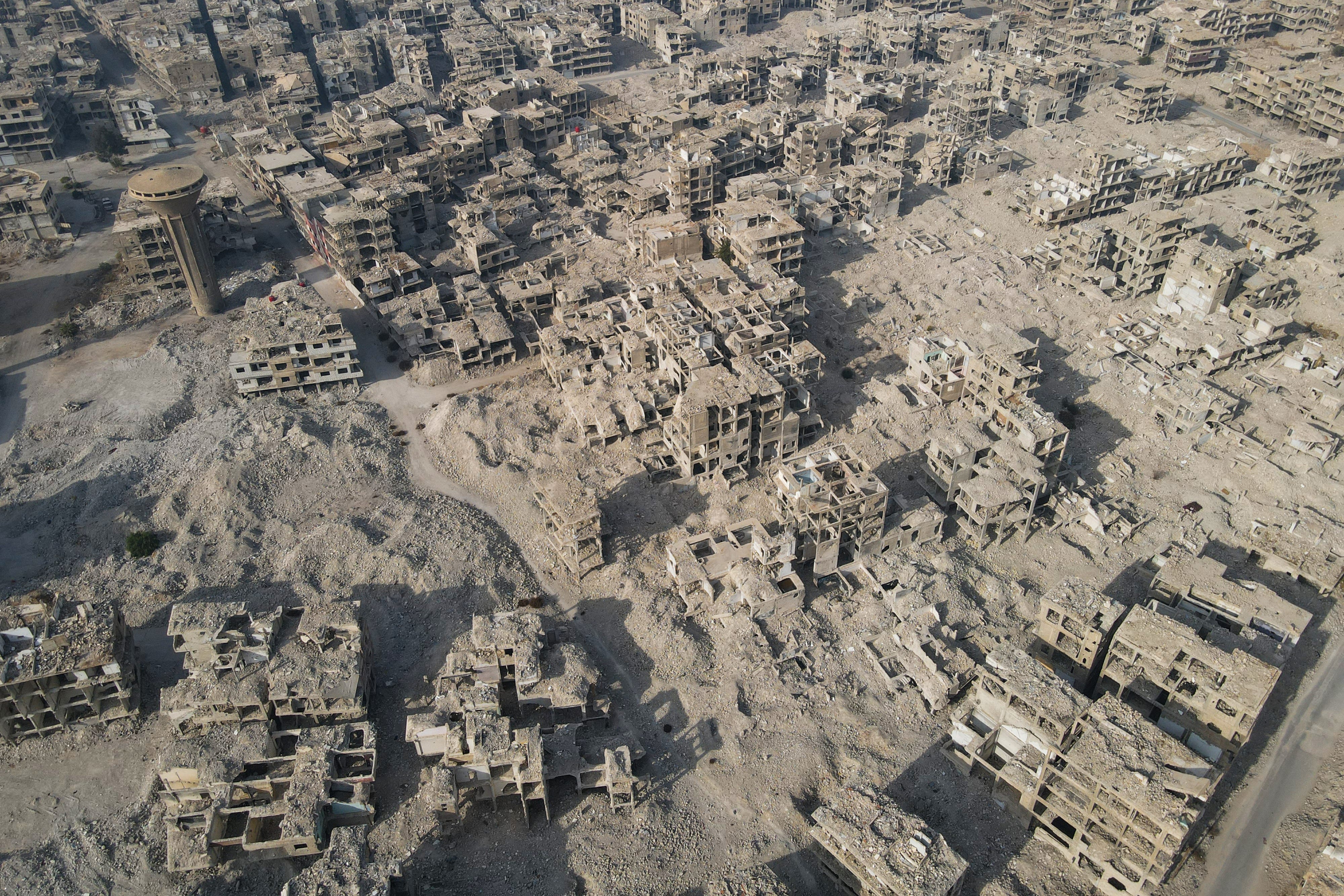 An aerial photo shows the destroyed buildings at the Yarmouk camp for Palestinian refugees in southern Damascus on December 10, 2024. The fall of president Bashar al-Assad has put Syria at a crossroads, after nearly 14 years of civil war sparked by his deadly crackdown on democracy protests. (Photo by Mohammed Al-Rifai/AFP Photo)