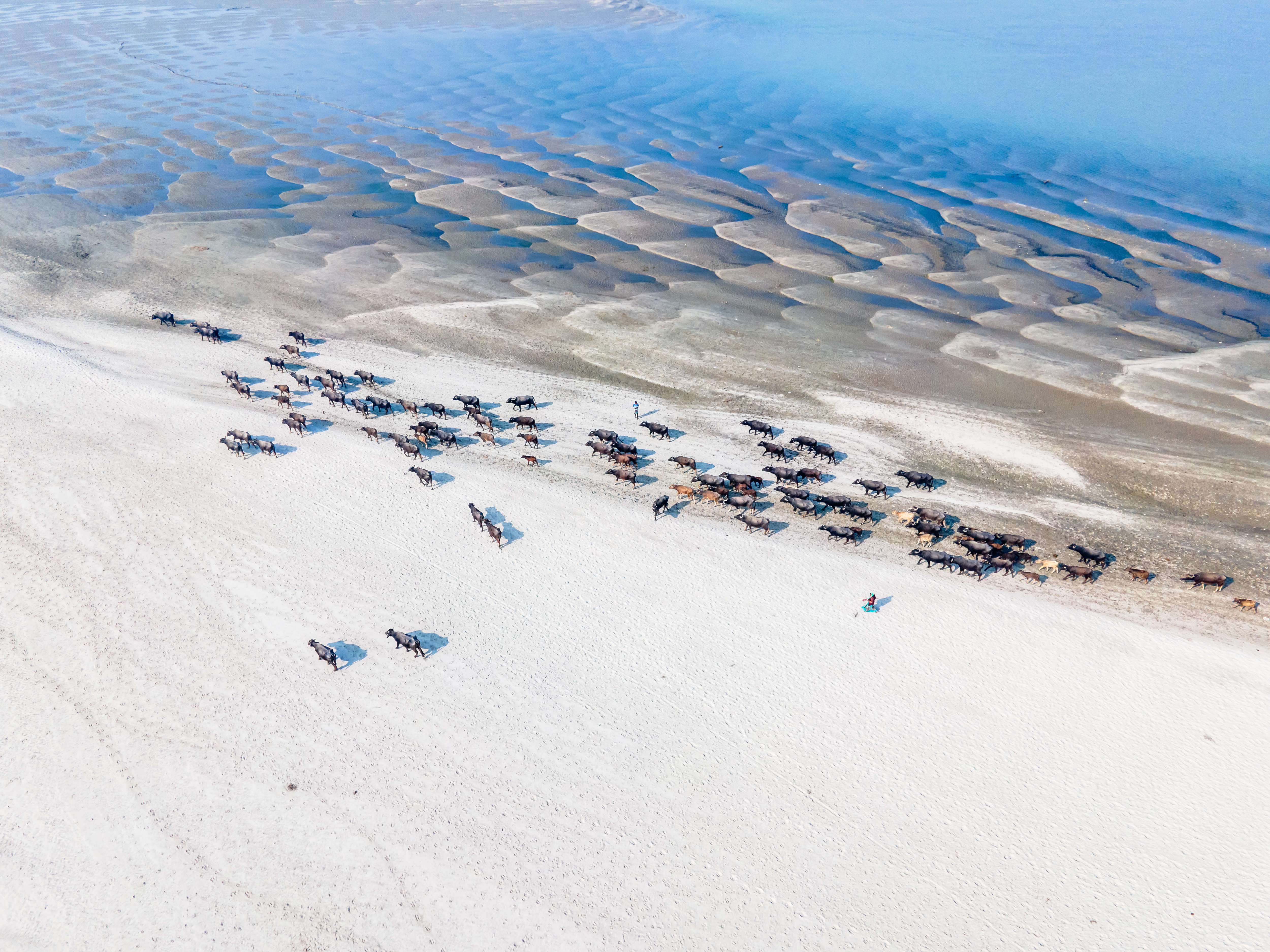 A buffalo herd crosses a dry riverbed near the Jamuna River in Gaibandha, Bangladesh on December 15, 2024. Dried waterways and shifting sandbars (chars) disrupt navigation and force herds to travel far for water. These unstable sand formations, deposited and eroded seasonally, highlight the fragile balance of life along the Jamuna River basin. (Photo by Muhammad Amdad Hossain/ZUMA Press Wire/Rex Features/Shutterstock)