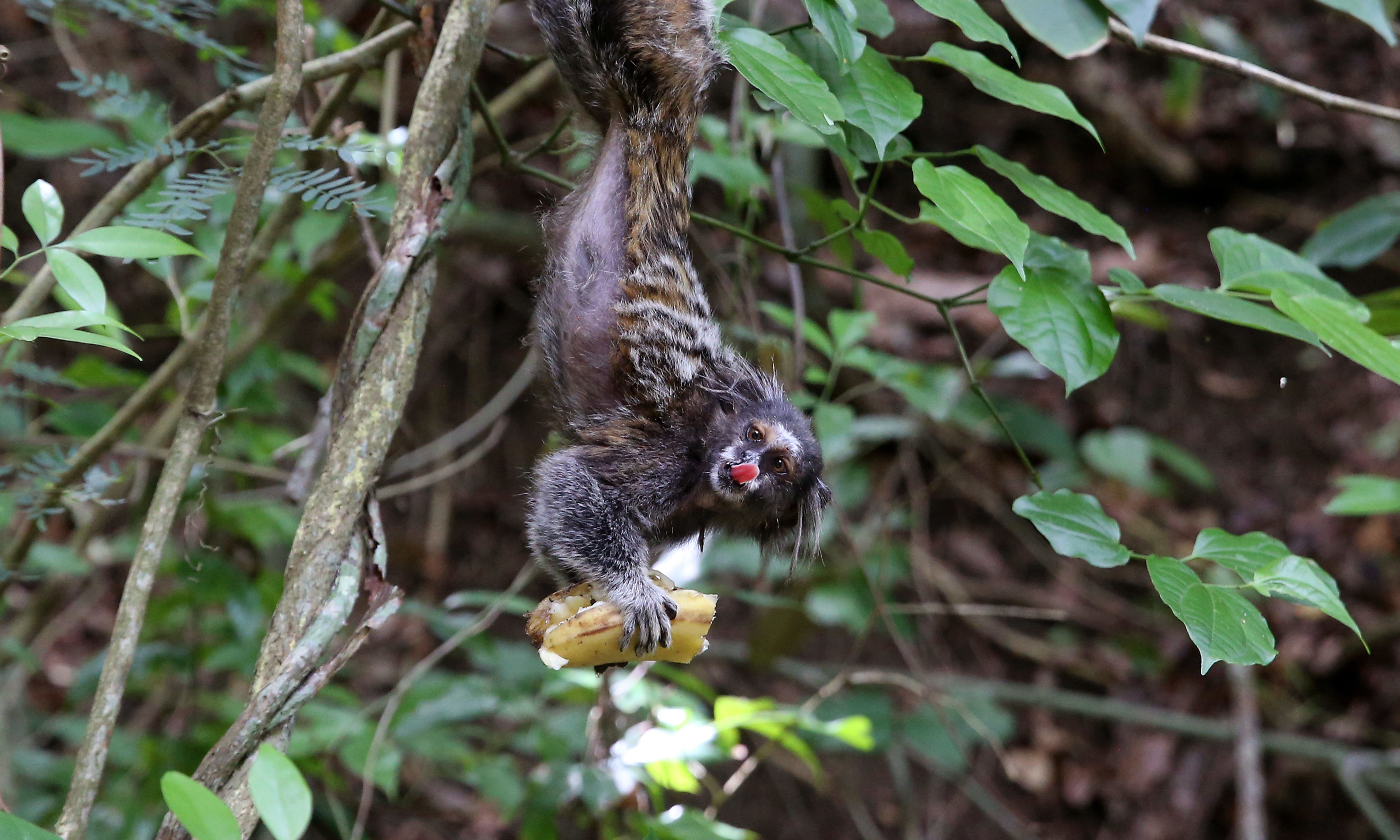 A nimble marmoset dangles upside down by its hind legs, enjoying a banana at Forte Duque de Caxias in Rio de Janeiro on December 13, 2024. Visitors can reach the top of Morro do Leme (Leme Mountain) via an 800-meter steep trail that winds through the lush Atlantic rainforest. Also known as Leme Fort, the stronghold was constructed between 1776 and 1799 during Brazil's time under Portuguese rule. (Photo by Bob Karp/ZUMA Press Wire/Rex Features/Shutterstock)