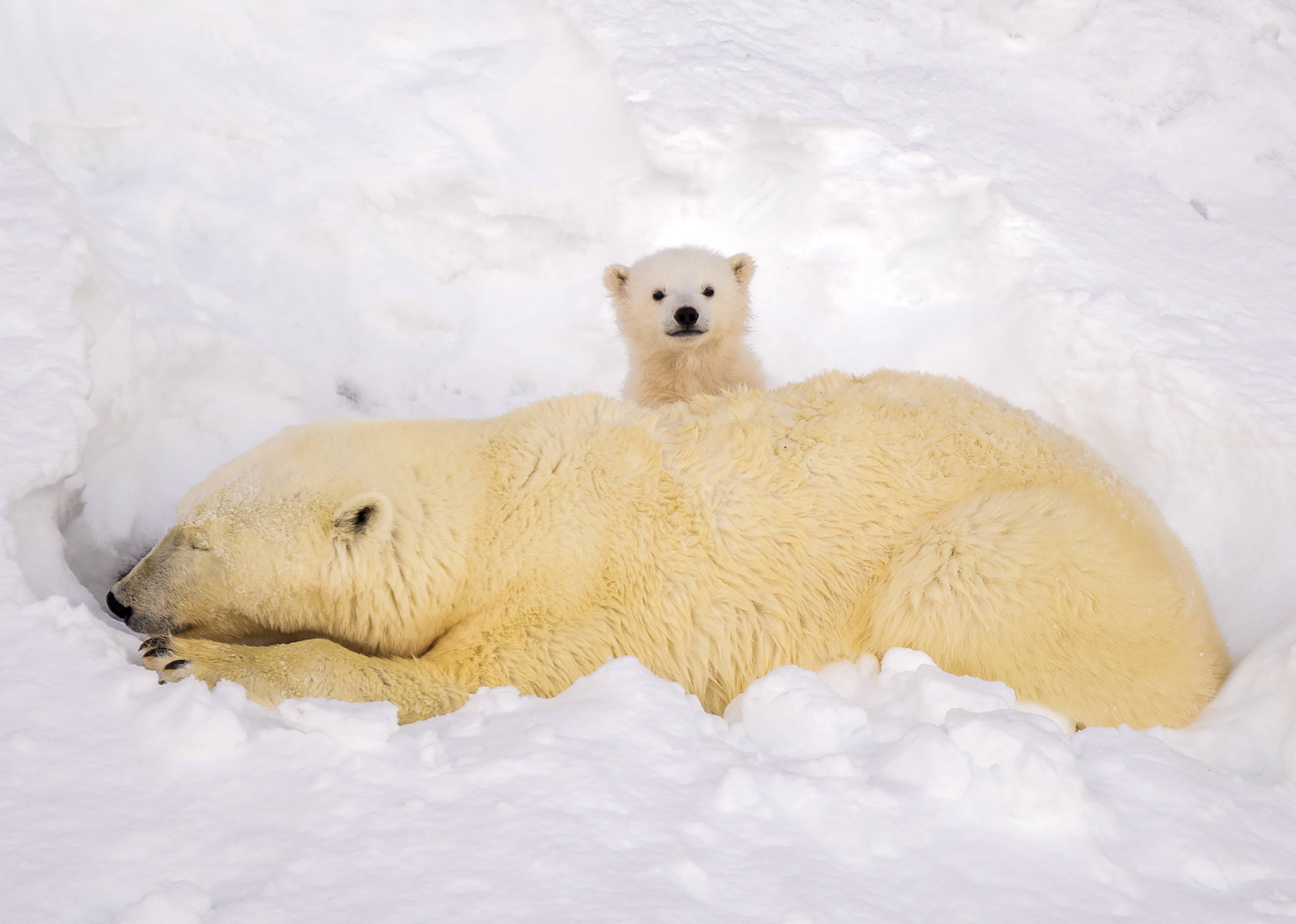 A polar bear cub keeps warm by snuggling up to its mother on Baffin Island, Canada in the last decade of December 2024. The mother is unlikely to have eaten since the autumn. (Photo by Simon Roberts/Solent News)