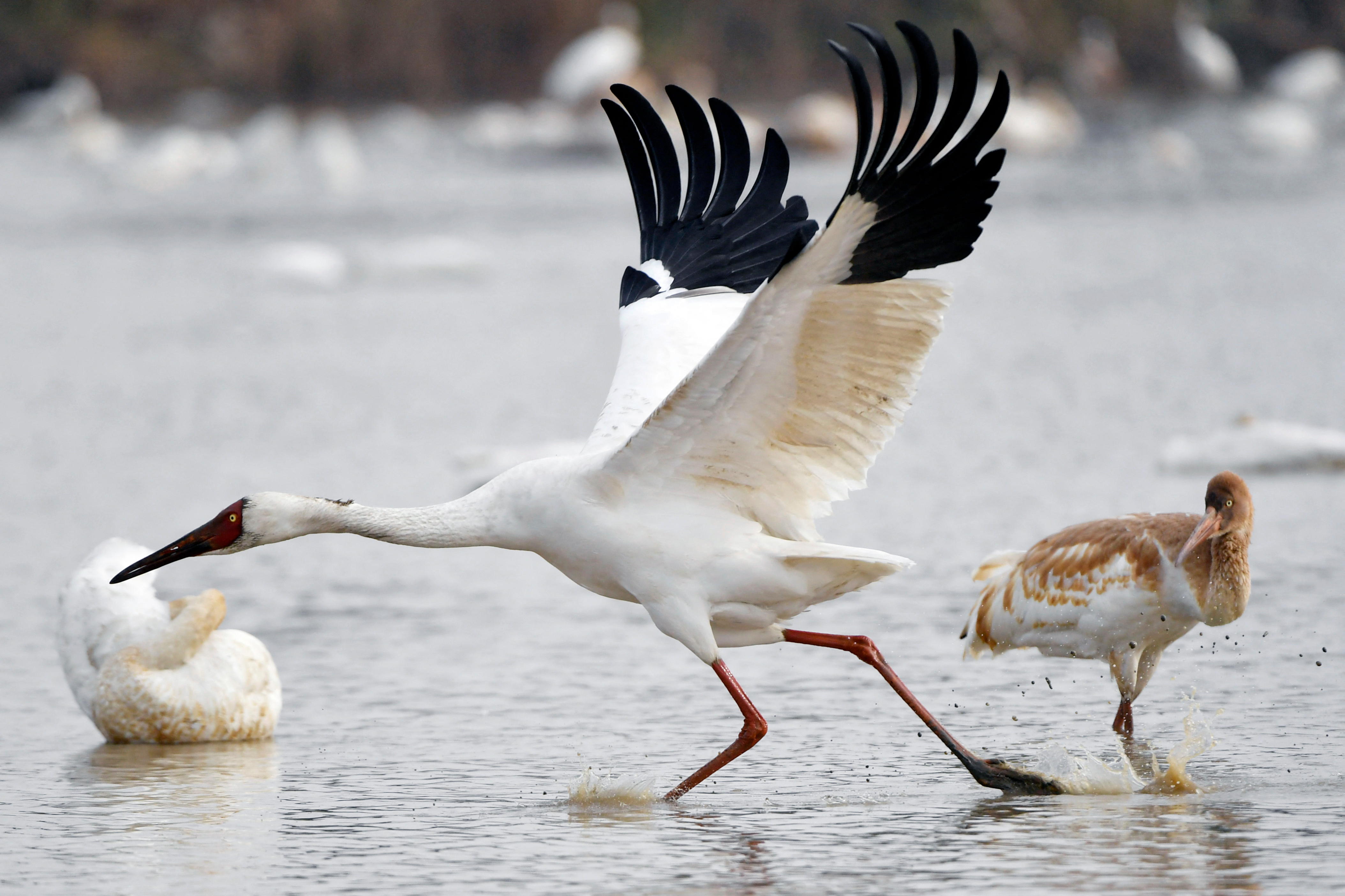 A Siberian crane, also known as white crane, prepares to take flight in Poyang lake in Jiujiang prefecture, China's eastern Jiangxi province, on December 17, 2024. (Photo by AFP Photo/China Stringer Network)