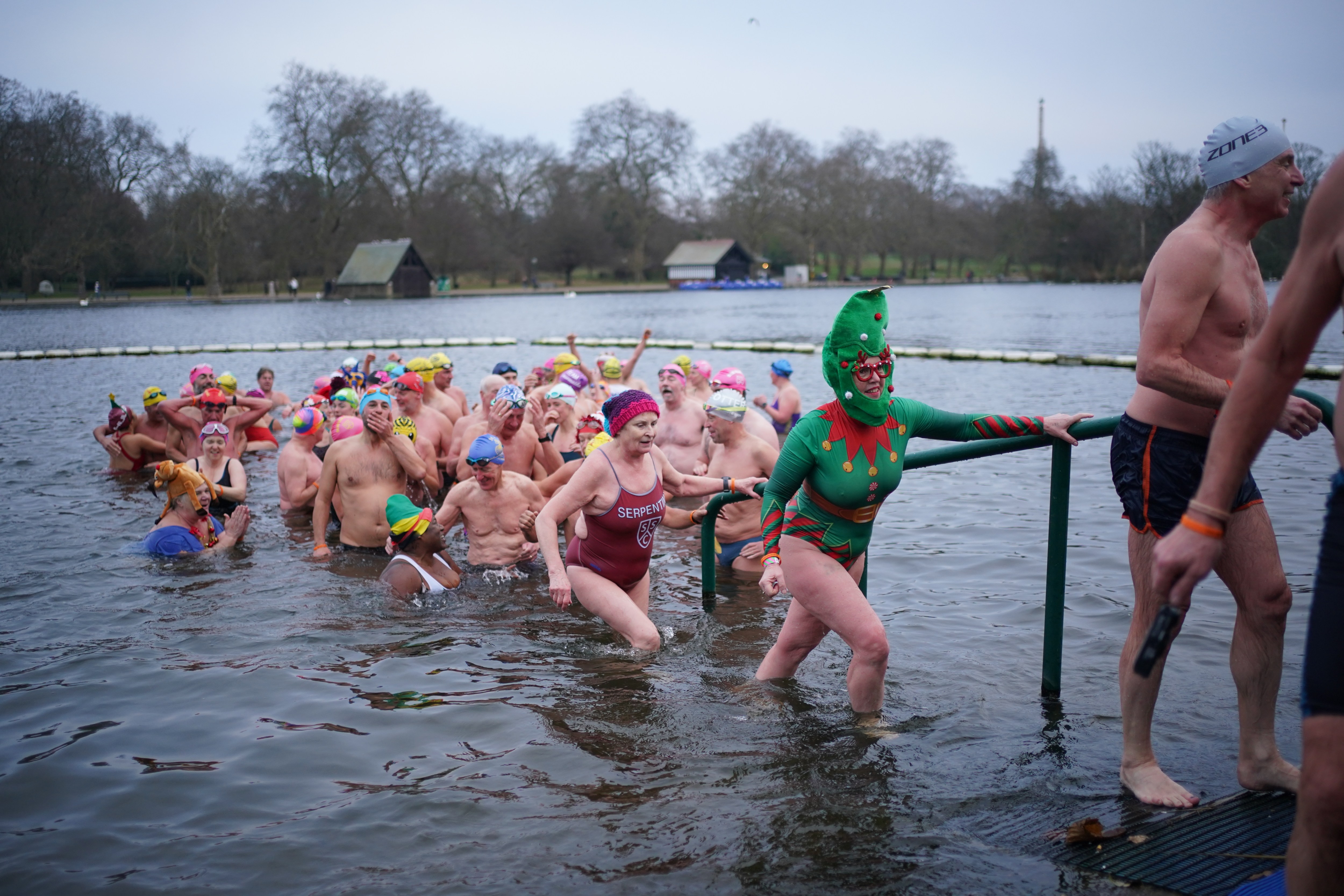 Members of the Serpentine Swimming Club take part in the Peter Pan Cup race, which is held every Christmas Day at the Serpentine, in Hyde Park, central London on Wednesday, December 25, 2024. (Photo by Yui Mok/PA Images via Getty Images)