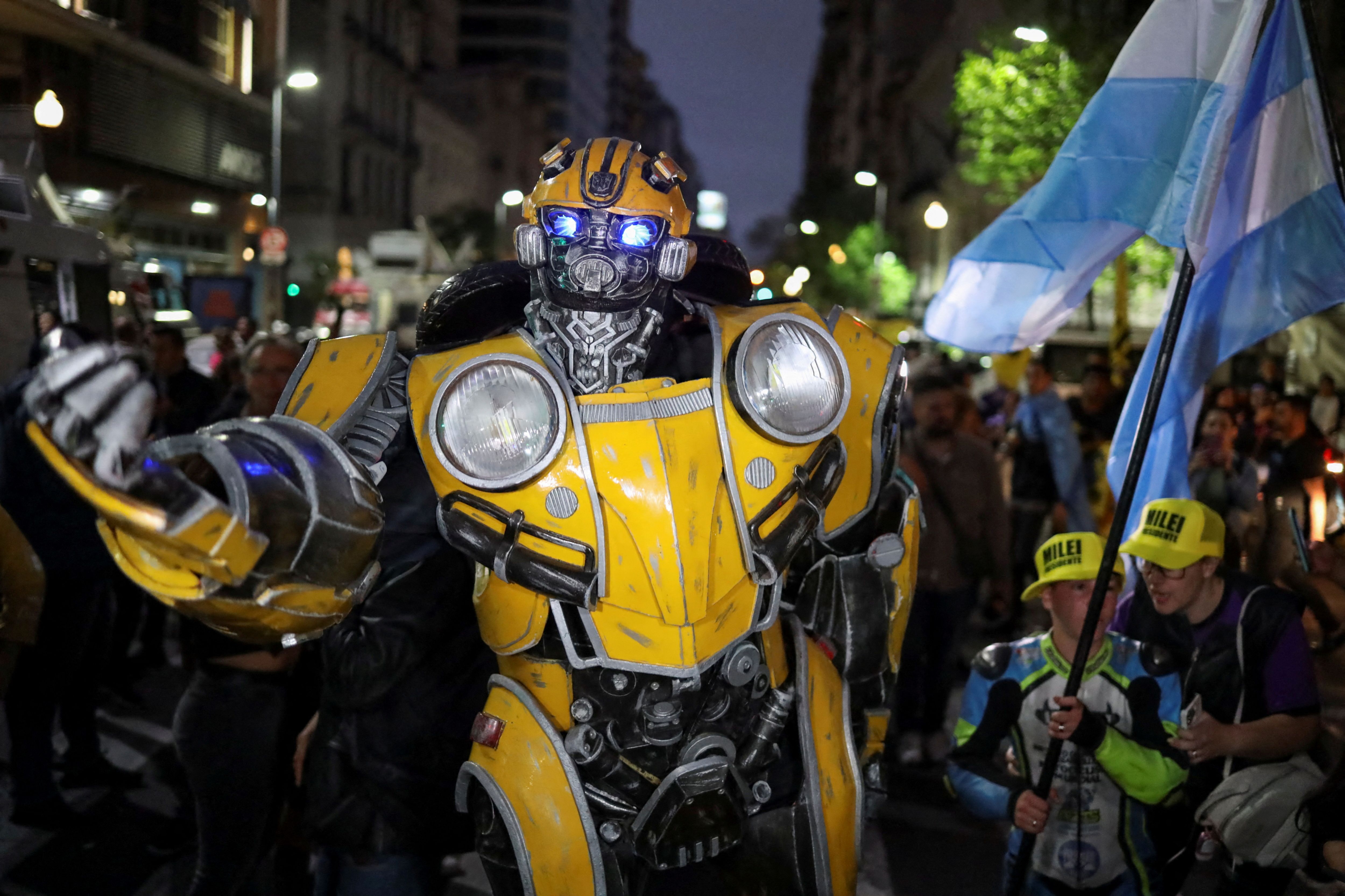 A person wears a Transformer character costume as supporters of Argentina's presidential candidate Javier Milei gather outside his campaign headquarters during Argentina's presidential election, in Buenos Aires, Argentina on October 22, 2023. (Photo by Cristina Sille/Reuters)