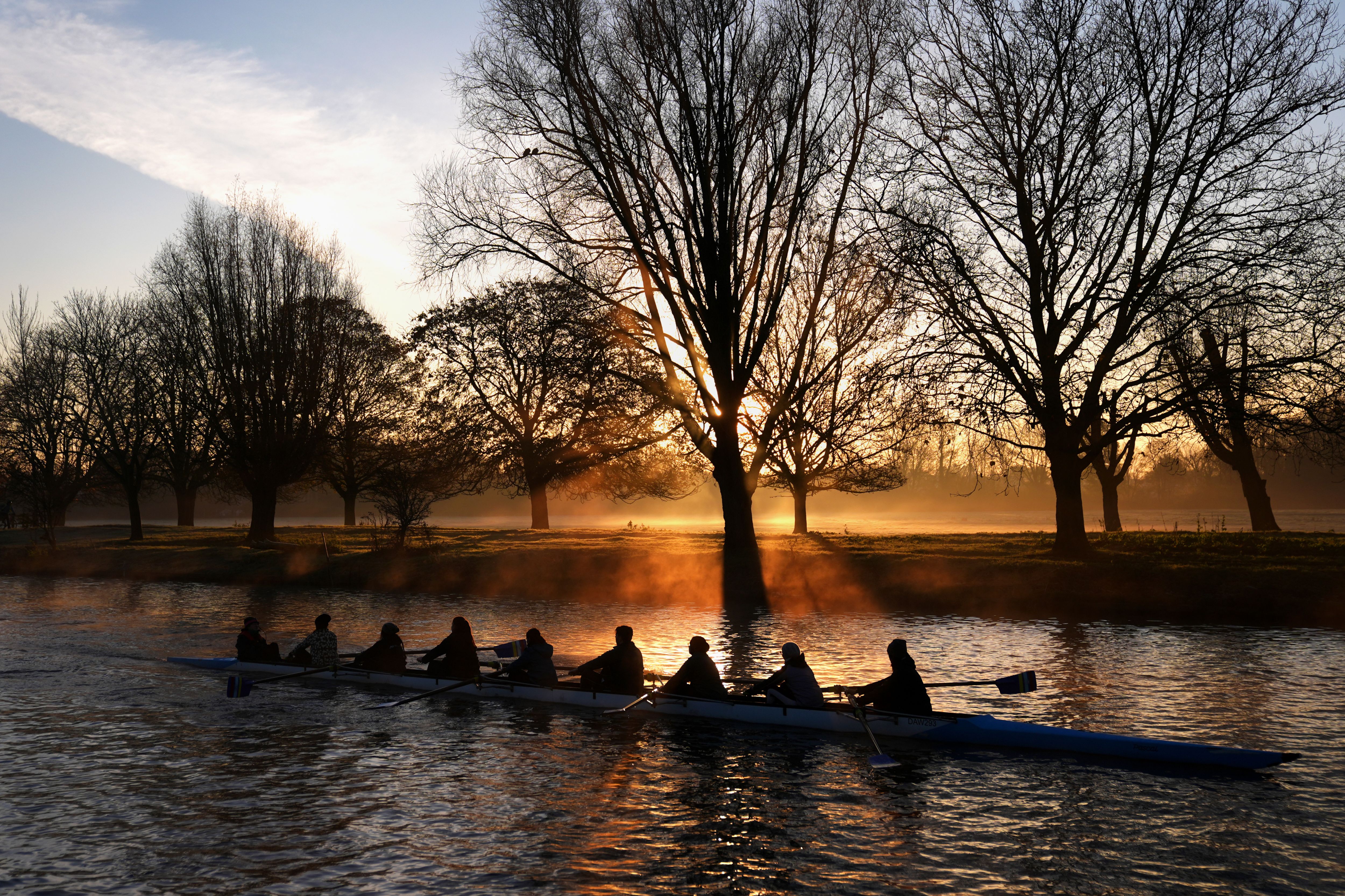 Rowers train at sunrise on the River Cam in Cambridge on Thursday, November 28, 2024. Clearer weather is forecast for the UK today as Storm Conall moves on to the Netherlands. (Photo by Joe Giddens/PA Images via Getty Images)