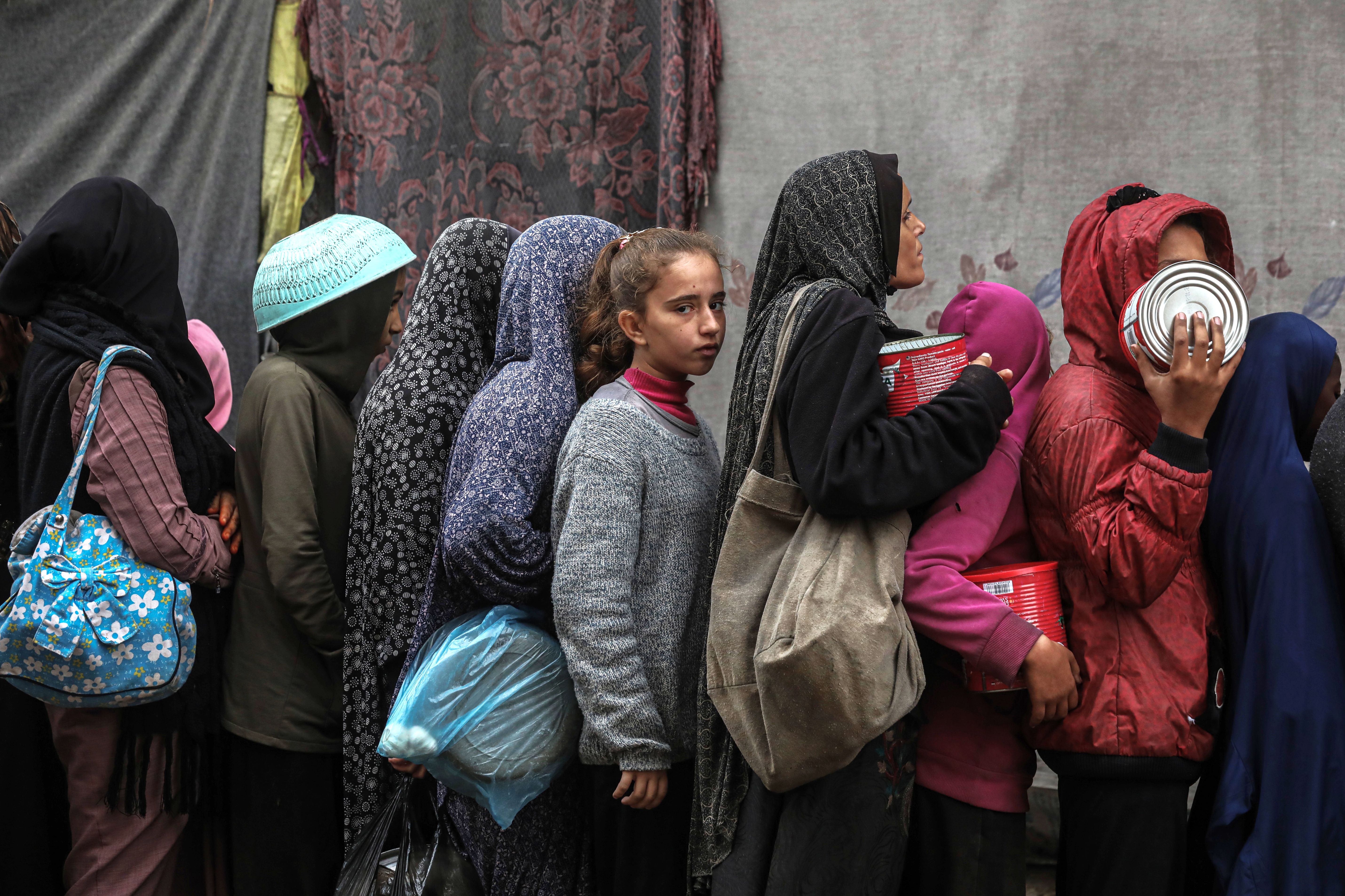 Palestinians gather to receive food cooked by a charity kitchen amid a hunger crisis as the Israel-Gaza conflict continues in Deir el-Balah, Central Gaza Strip, on December 20, 2024. (Photo by APA Images/Rex Features/Shutterstock)