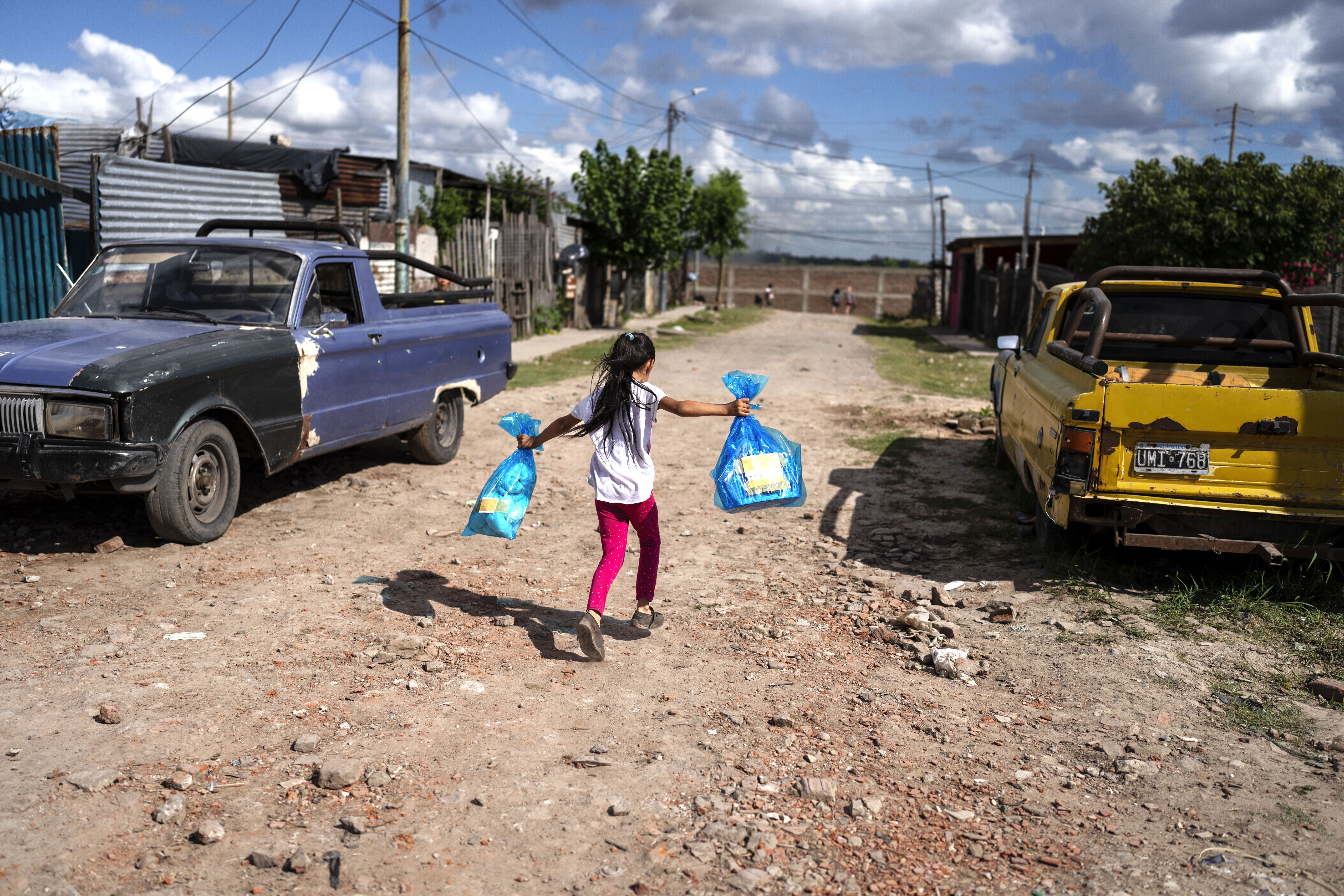 Madeleine Bordon runs home with gifts in hand that she received at a pre-Christmas celebration organized by “Los Chicos de la Via” soup kitchen, in Buenos Aires, Argentina, December 14, 2024. (Photo by Rodrigo Abd/AP Photo)