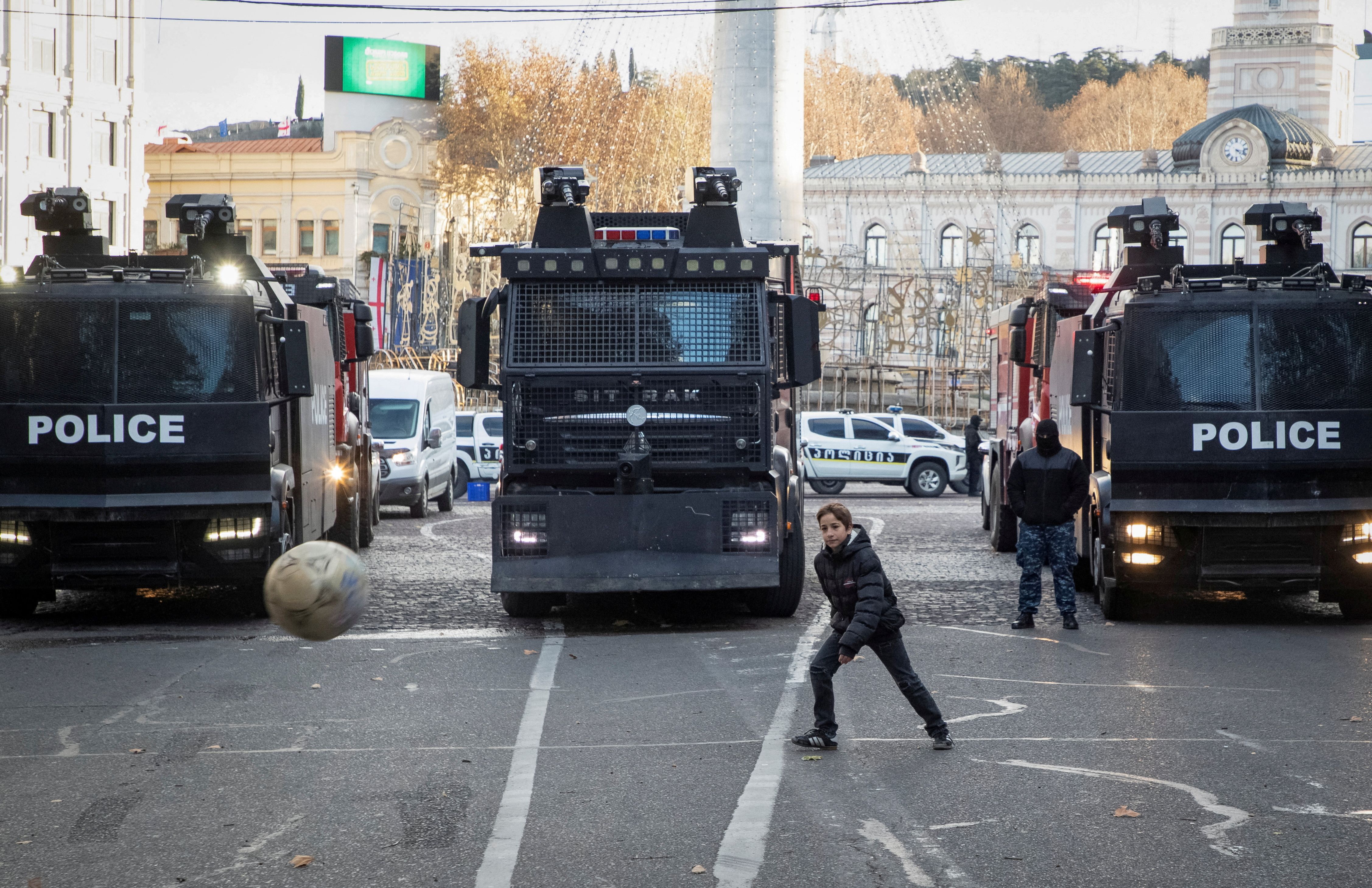 A boy plays in front of riot police trucks outside the parliament building, as deputies vote to elect a new president, in Tbilisi, Georgia on December 14, 2024. (Photo by Daro Sulakauri/Reuters)