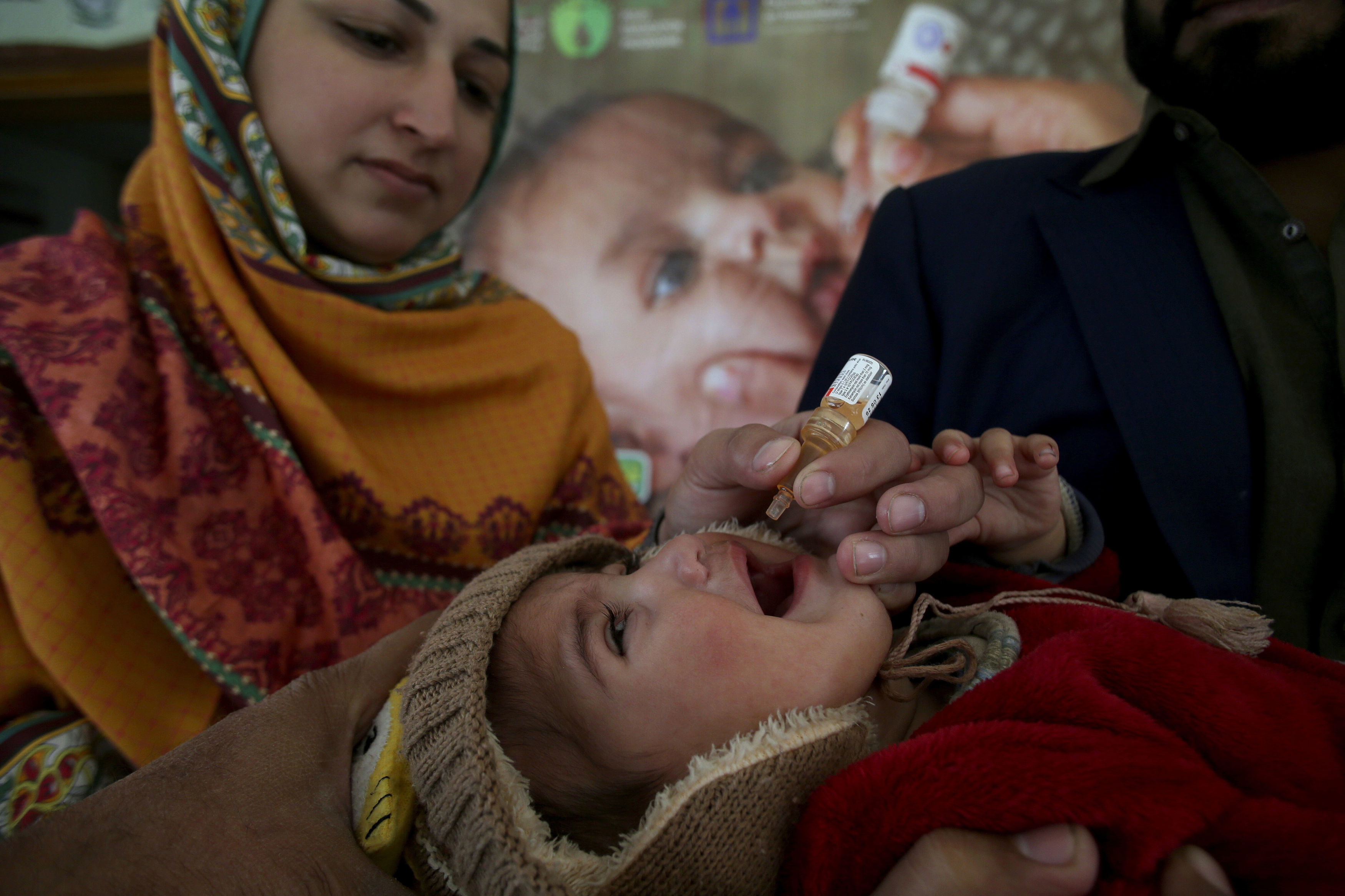 A health worker administers a polio vaccine to a child at a health center in Peshawar, Pakistan, Monday, December 16, 2024. (Photo by Muhammad Sajjad/AP Photo)