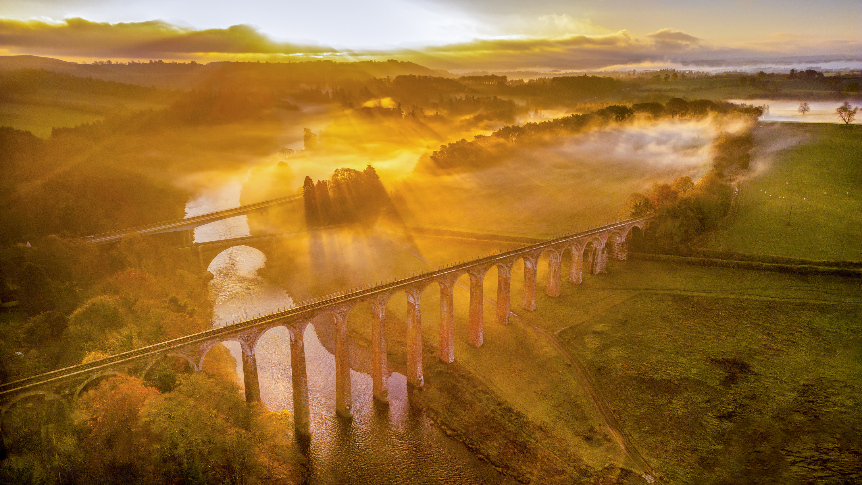 The sun rises over the misty landscape above the River Tweed, with a view of the three bridges that span the river that winds its way through the South of Scotland on November 7, 2024. (Photo by Phil Wilkinson)