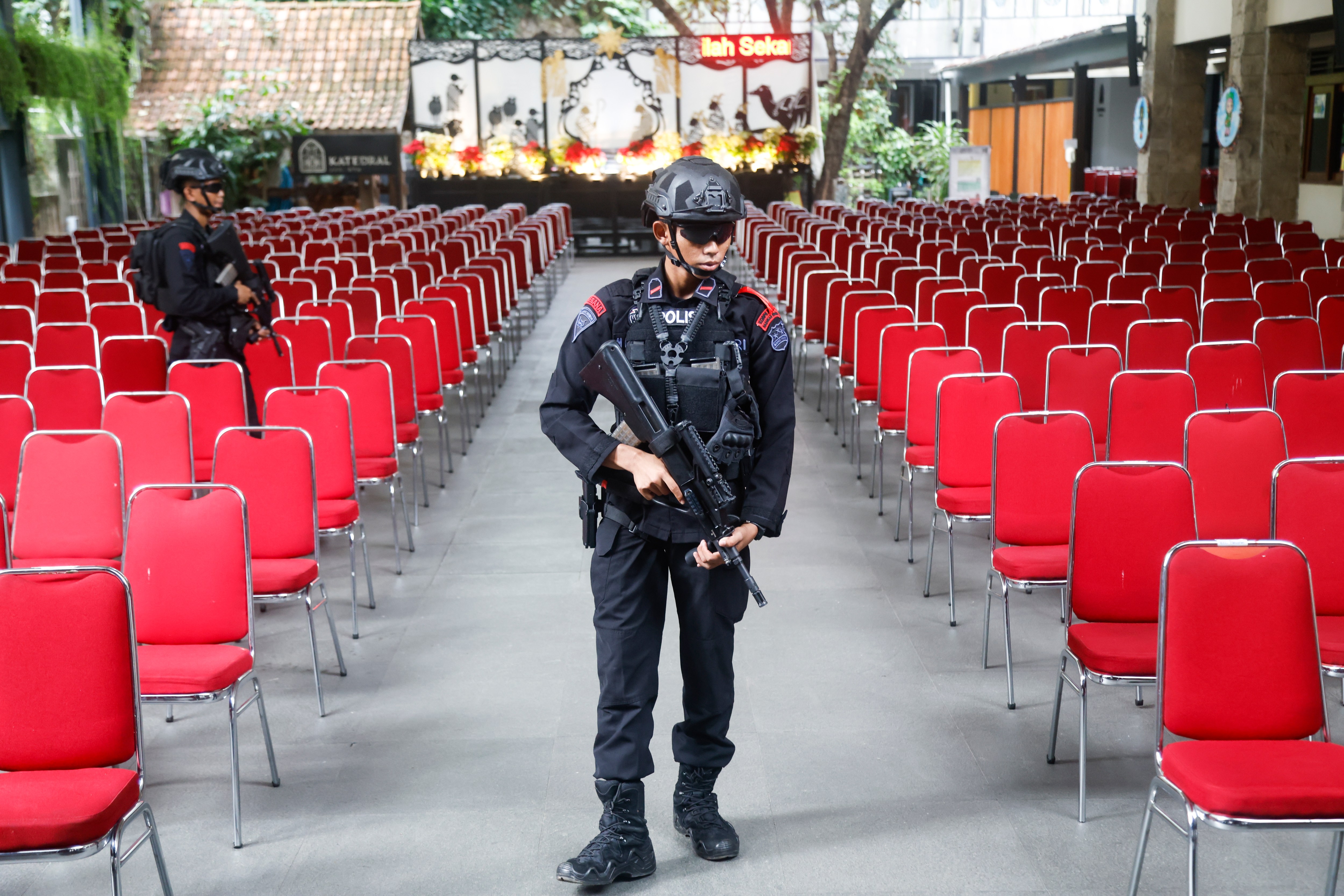 Two police officers from the Indonesian bomb squad inspect an area within the cathedral on Christmas Eve in Jakarta, Indonesia, 24 December 2024. The Indonesian National Police announced the deployment of extensive personnel and resources, including air ambulance services, to ensure public safety during the upcoming Christmas and New Year holidays. (Photo by Bagus Indahono/EPA/EFE)