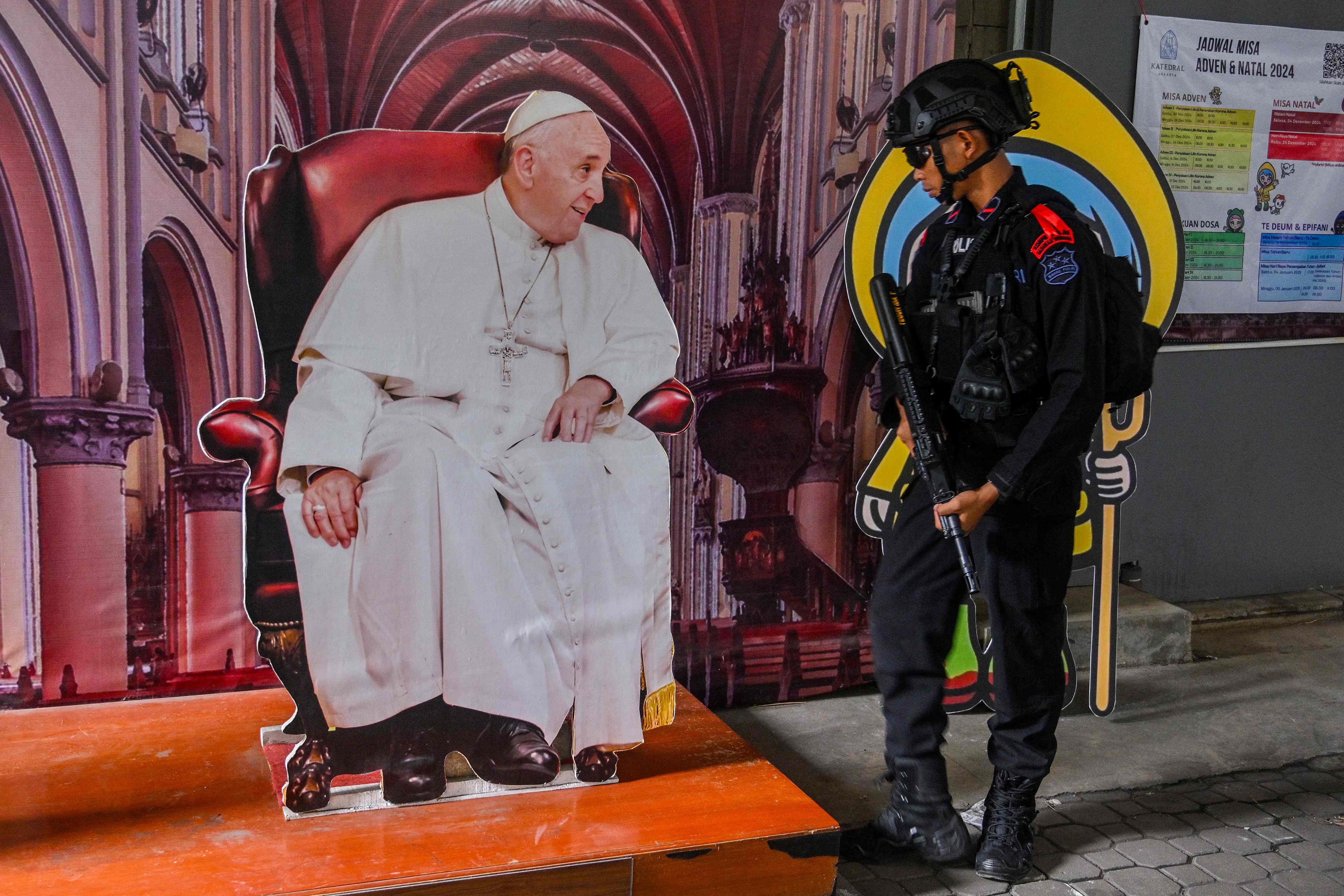 An anti-terror policeman conducts a security check near a life-size cutout of Pope Francis at the Jakarta Cathedral on Christmas eve in Jakarta on December 24, 2024. (Photo by Juni Kriswanto/AFP Photo)