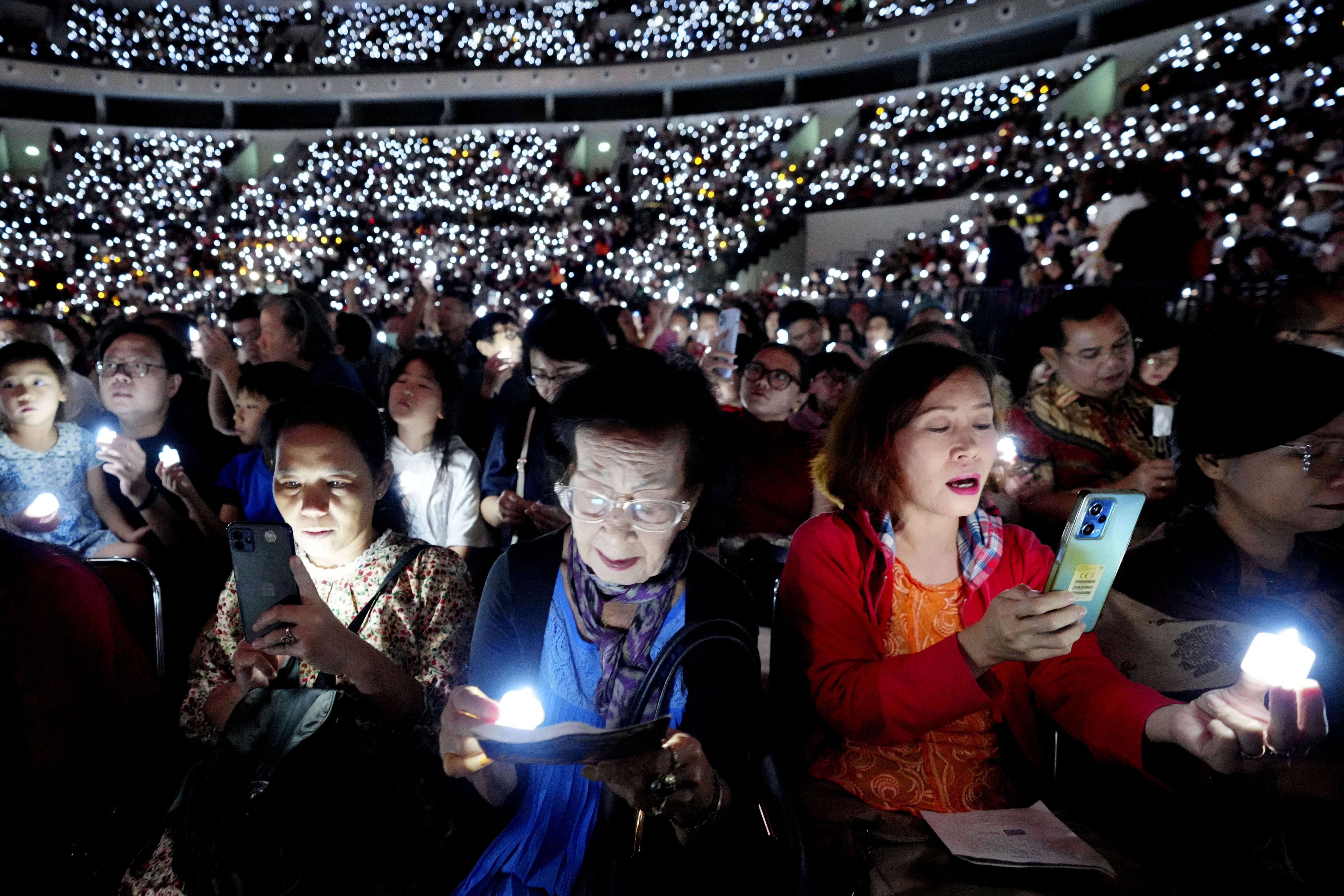 People hold electric candles as they sing during a Christmas Eve service at Indonesia Arena stadium in Jakarta, Indonesia, Tuesday, December 24, 2024. (Photo by Tatan Syuflana/AP Photo)