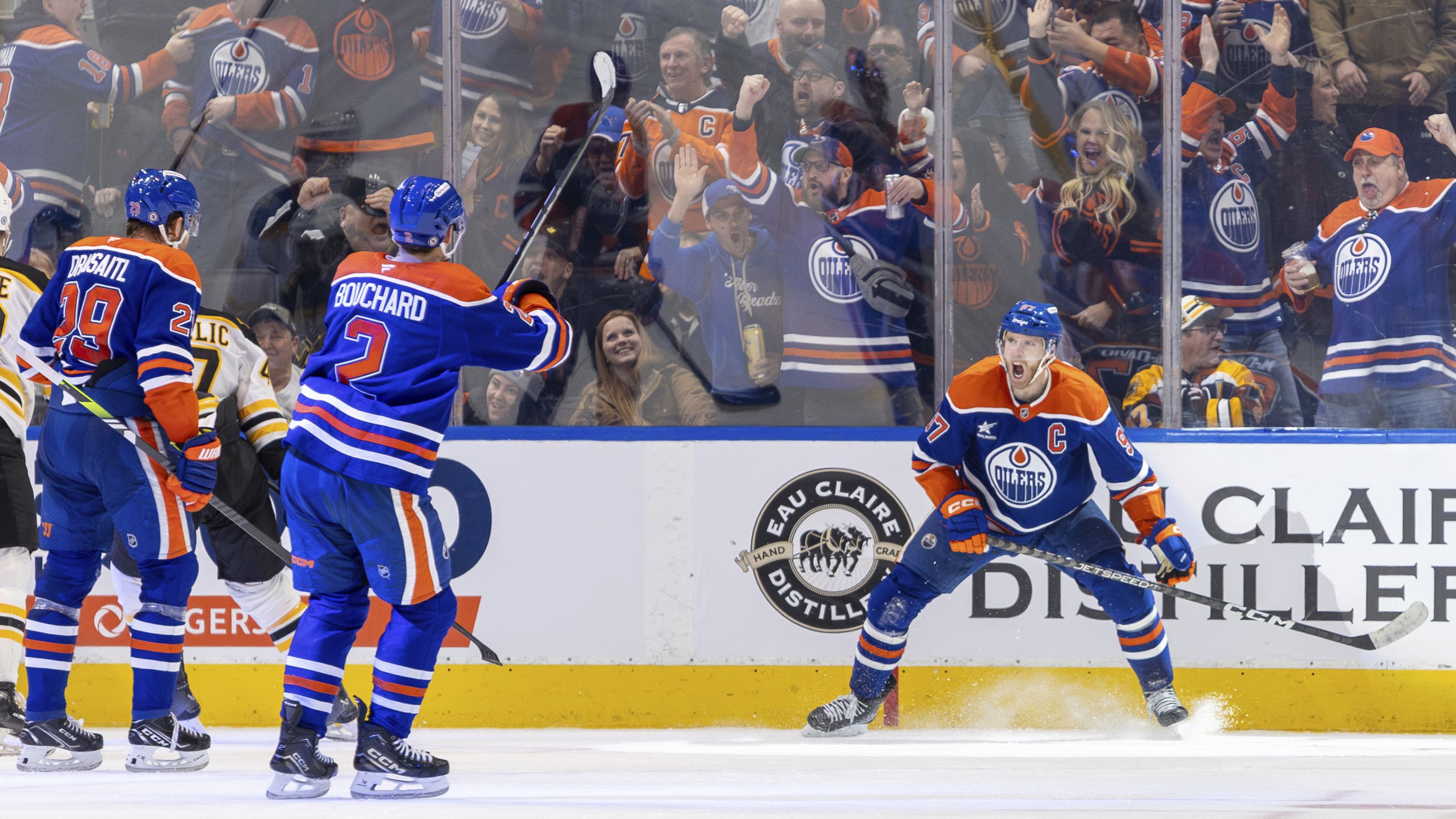 Edmonton Oilers' Connor McDavid (97) celebrates his goal against the Boston Bruins with Evan Bouchard (2) and Leon Draisaitl (29) during the third period of an NHL hockey game in Edmonton, Alberta, Thursday, December 19, 2024. (Photo by Timothy Matwey/The Canadian Press via AP Photo)