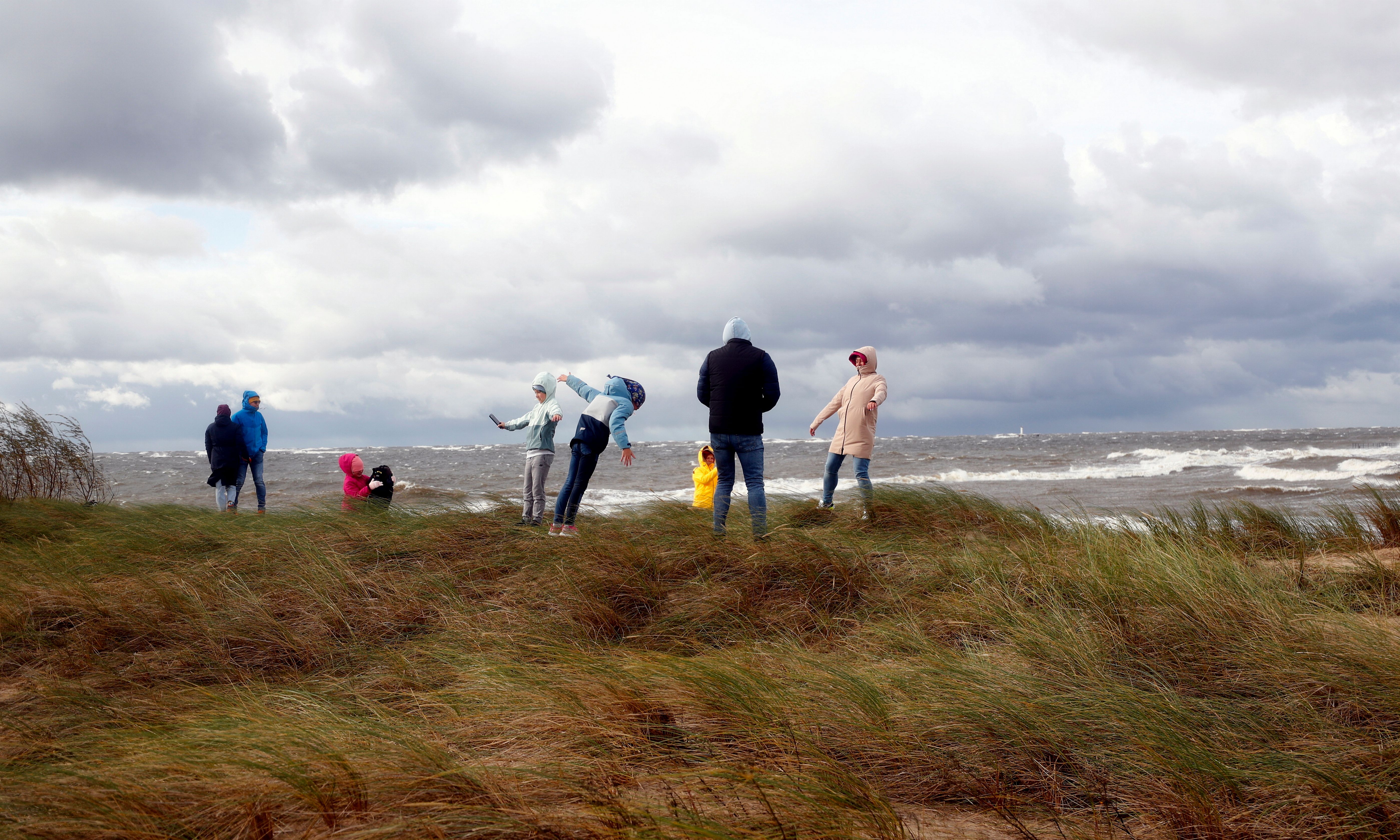 People enjoy a walk during stormy weather at Mangalsala beach in Riga neighborhood, Latvia, 08 October 2023. High, gusty winds persist in Latvia on 08 October, though they have abated slightly compared to the storm the previous days. Nevertheless, a yellow warning for high winds remains in place across the country and is upgraded to an orange warning along the coast. (Photo by Toms Kalnins/EPA/EFE)