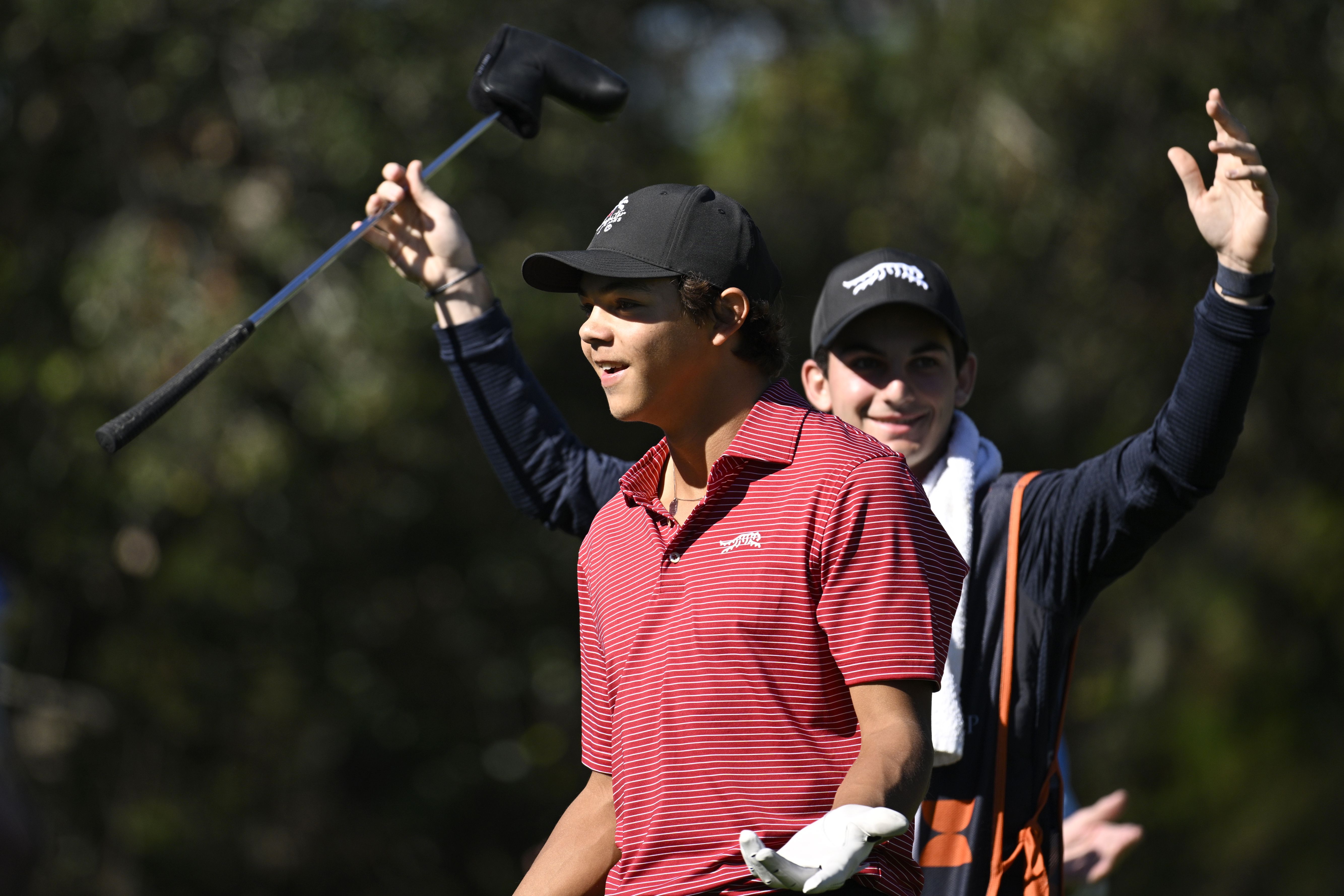 Charlie Woods, front, and his caddie Luke Wise react after his hole-in-one on the fourth hole during the final round of the PNC Championship golf tournament, Sunday, December 22, 2024, in Orlando, Fla. (Photo by Phelan M. Ebenhack/AP Photo)