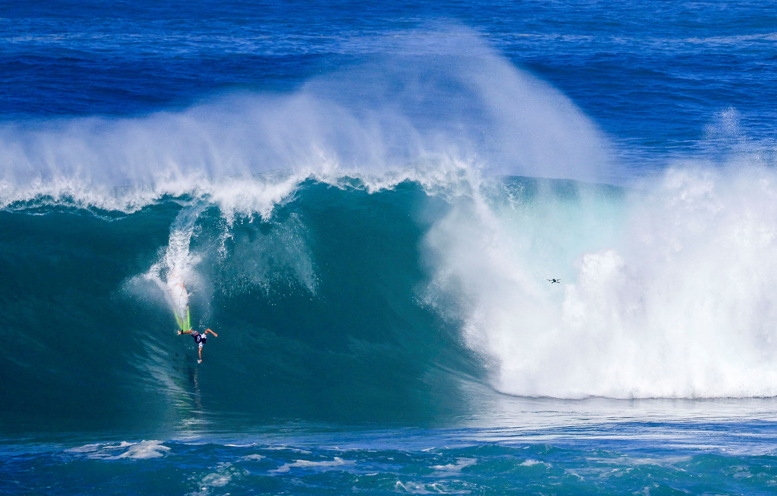 A professional surfer falls from their board during the Eddie Aikau Big Wave Invitational surfing event at Waimea Bay near Pupukea, Hawaii, U.S. December 22, 2024. (Photo by Marco Garcia/Reuters)