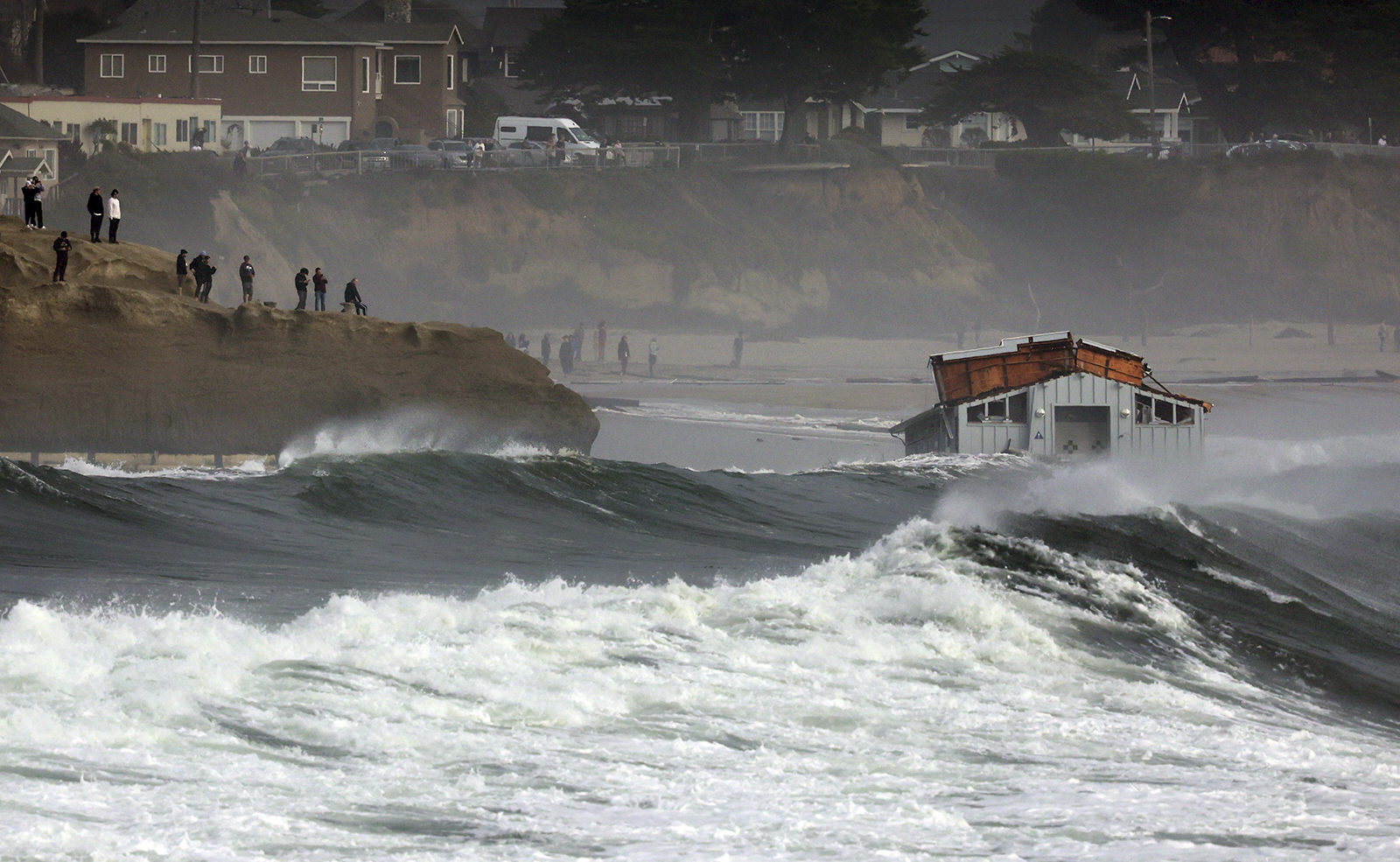 A building floats in the ocean after a wharf partially collapsed Monday, December 23, 2024, in Santa Cruz, Calif. (Photo by Shmuel Thaler/The Santa Cruz Sentinel via AP Photo)