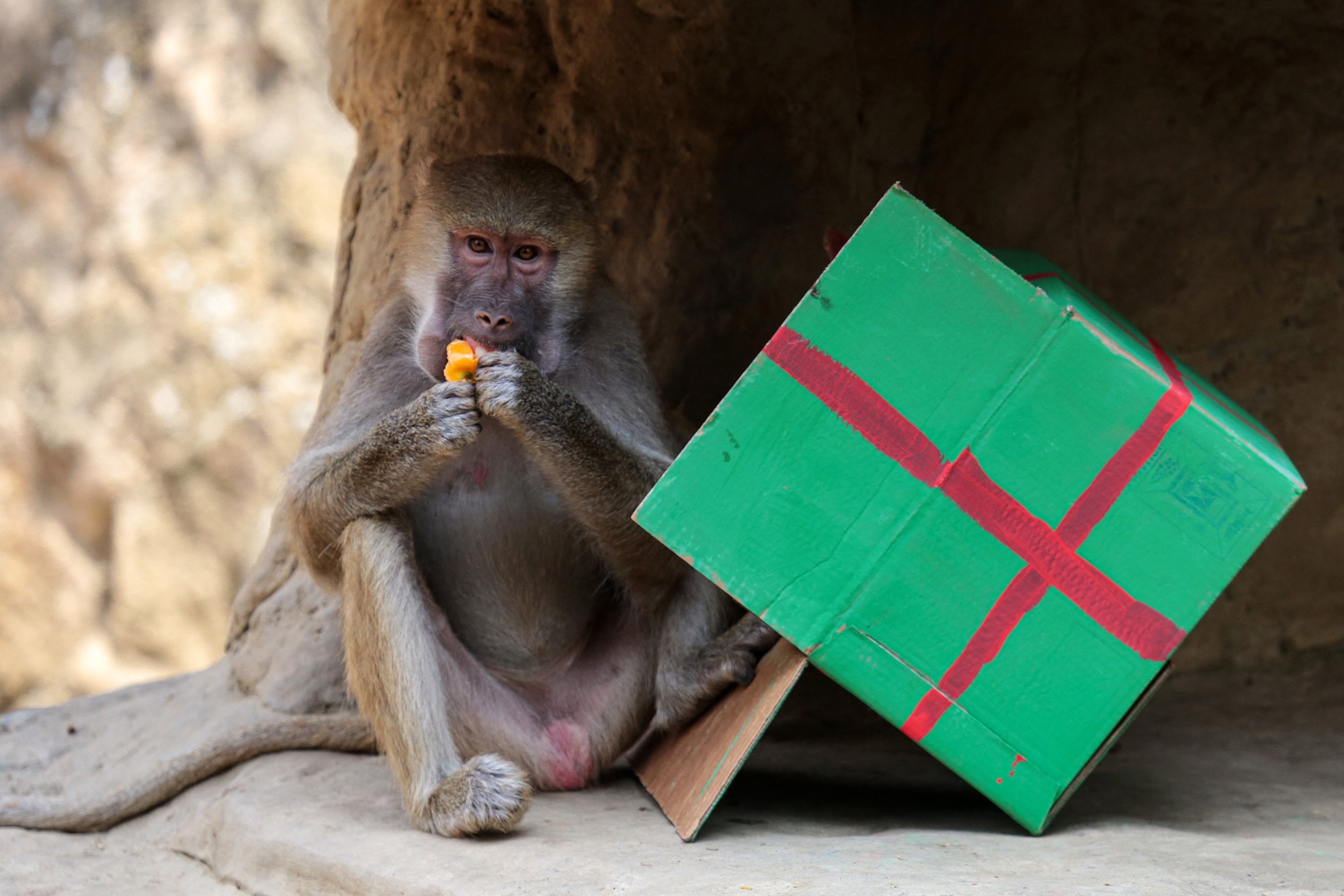A baboon (Papio hamadryas) receives food wrapped as a Christmas gift by zookeepers at the Cali Zoo in Cali, Colombia, on December 19, 2024. (Photo by Iusef Rojas/AFP Photo)