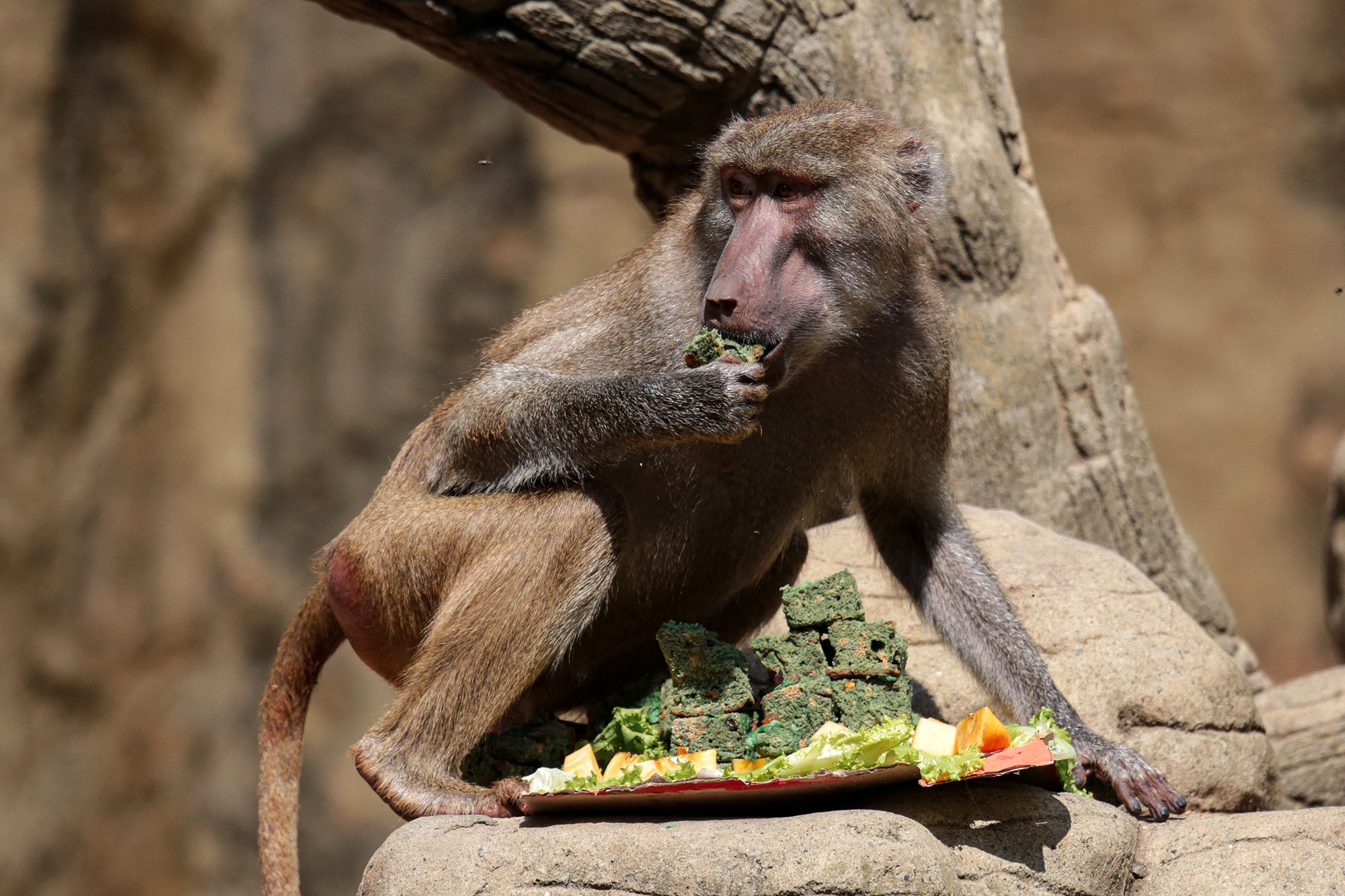 A baboon (Papio hamadryas) receives food wrapped as a Christmas gift by zookeepers at the Cali Zoo in Cali, Colombia, on December 19, 2024. (Photo by Iusef Rojas/AFP Photo)